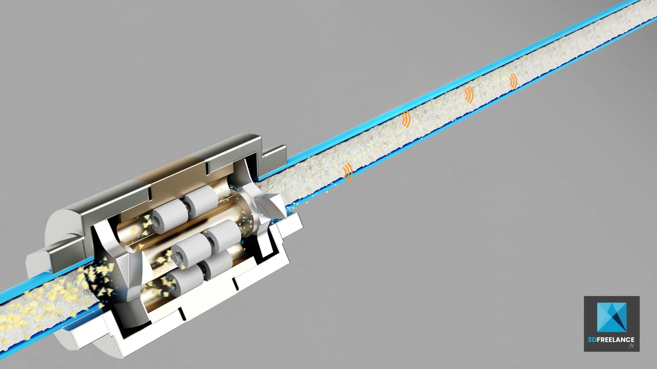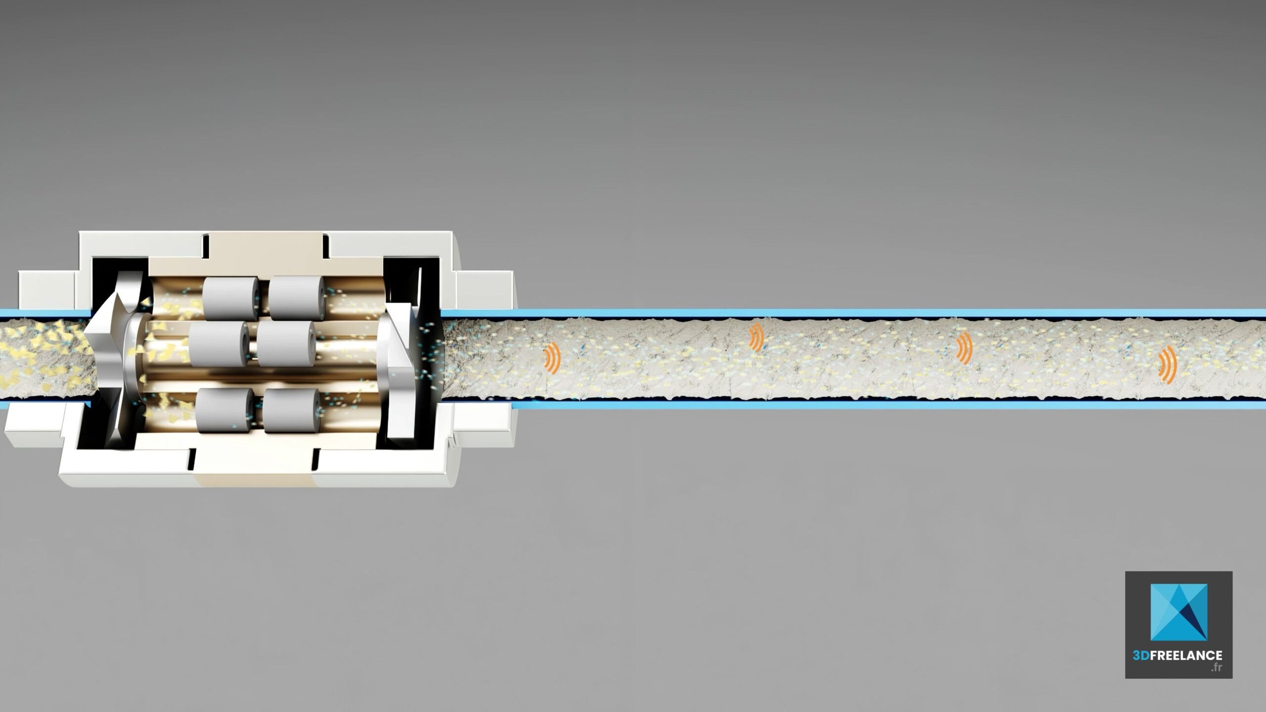 Création d’une animation 3D technique de particules pour expliquer l’action de nettoyage du calcaire dans une tuyauterie grâce à la technologie Drag’eau.