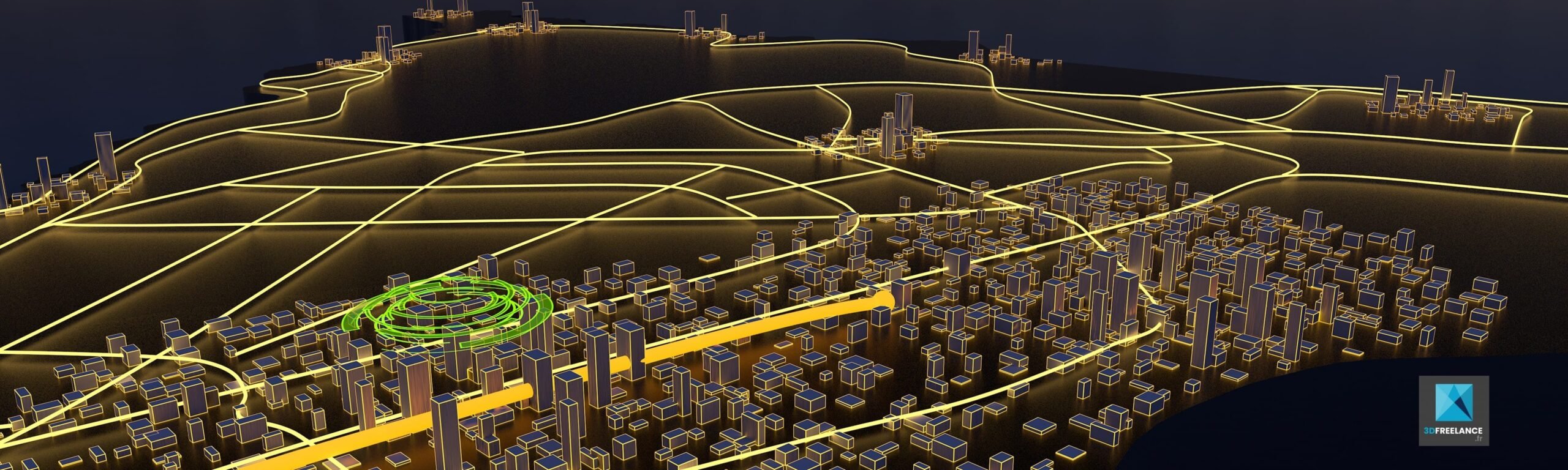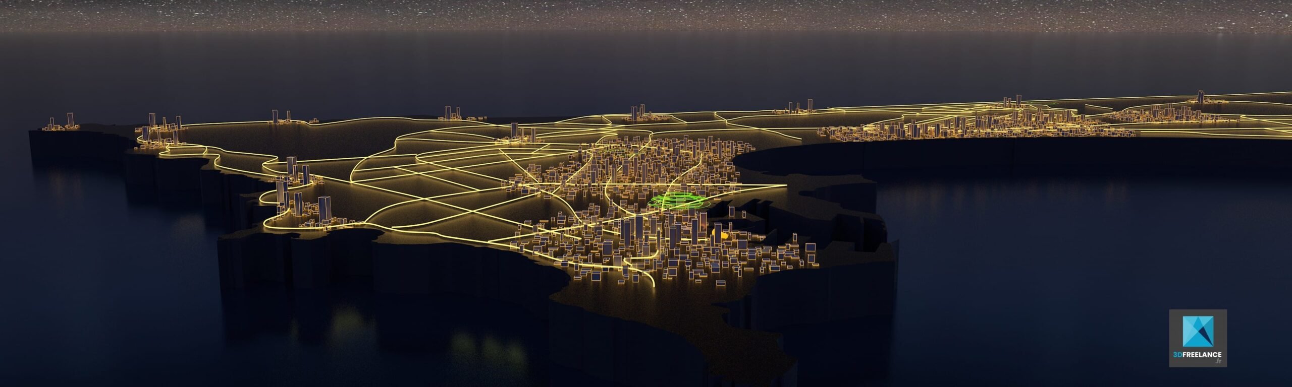 Création du survol de la ville de Dakar en images de synthèse 3D pour une inauguration. Cette animation 3D a été projetée sur une façade de bâtiment (d’où la découpe). Animation 3D pour un projet événementiel, la camera suit le trajet du train, du centre ville jusqu’à l’aéroport de Dakar, Sénégal. Vidéo calculée au format UHD 4K (animation 3d ville)
