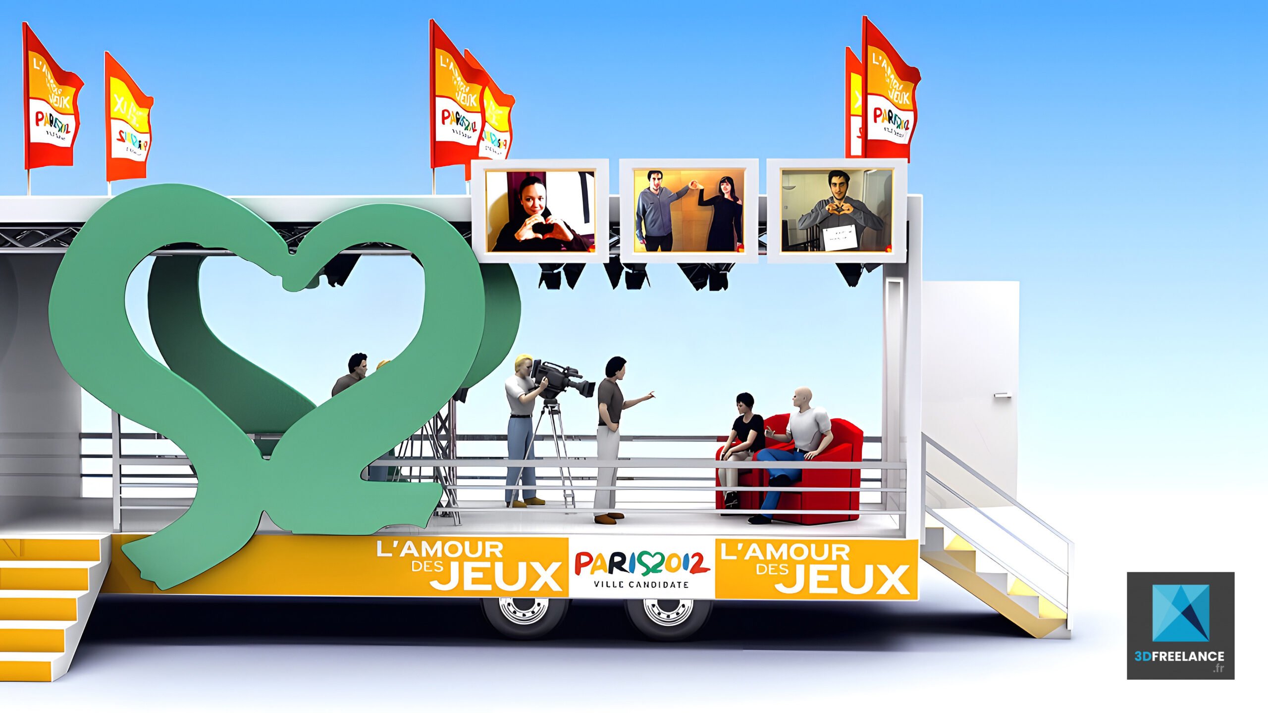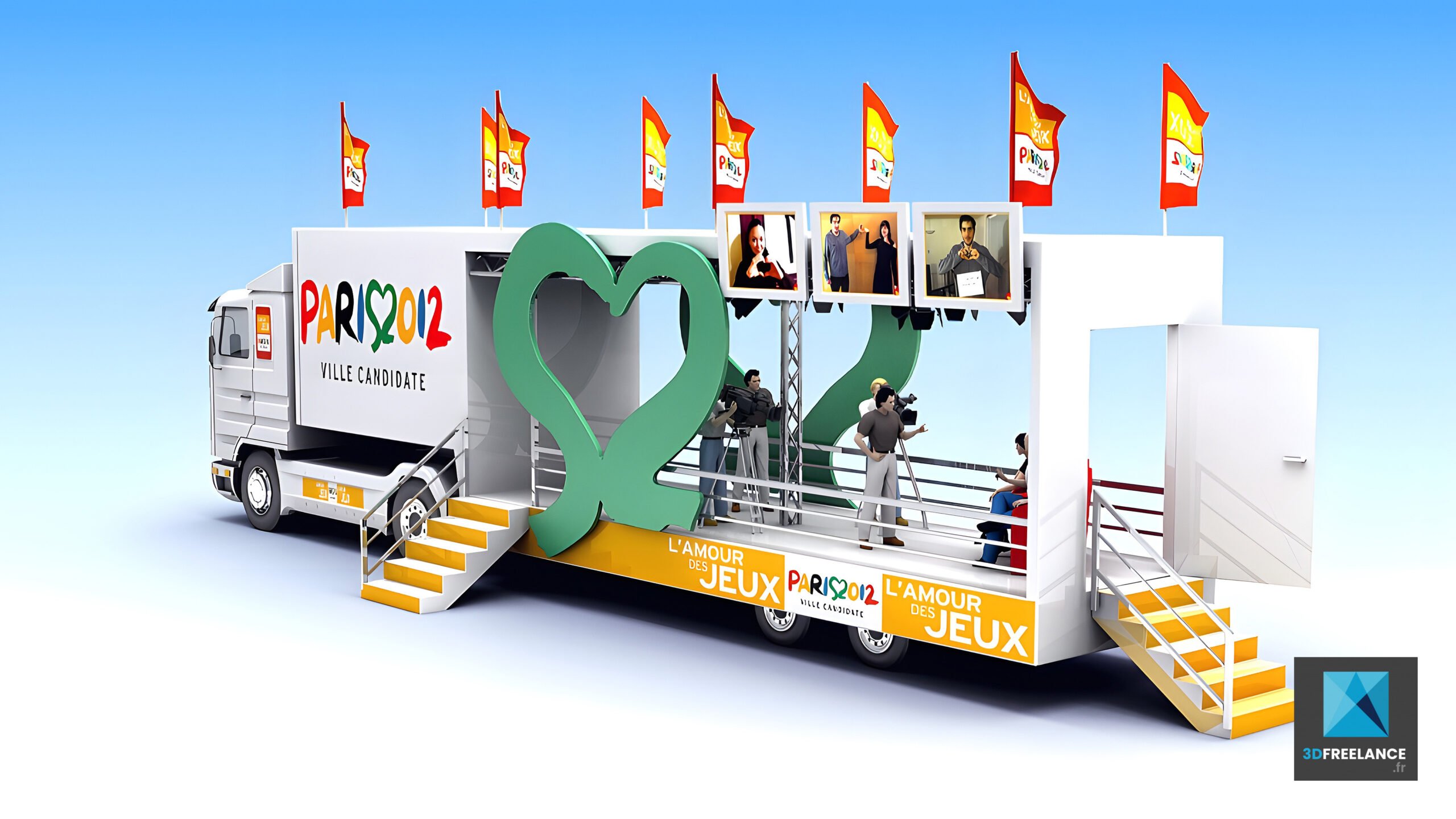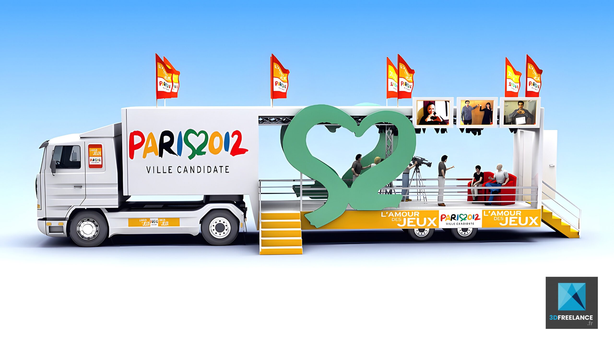 Création d’un camion événementiel pour des roadshow. Design d’un camion podium. Camion événementiel Paris 2012. Roughs 3D pour le dossier de candidature de Paris à l’organisation des Jeux Olympiques de 2012.