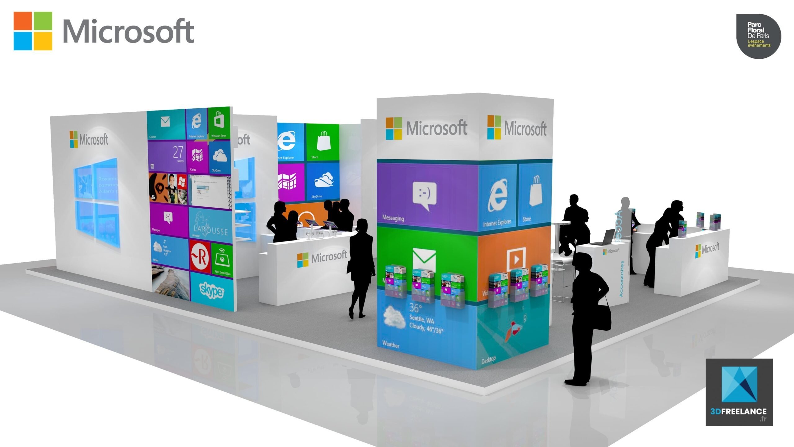 Création d’un concept de stand pour un salon pour Microsoft. Design d’un stand pour Microsoft au Parc floral de Paris 2013 et création de perspectives 3D, rough 3D de stand. Le stand est composé de différents espaces : 1 double desk d’accueil, 1 espace mange debout, 5 espaces pour les démos et un espace pour les mini conférences. La superficie du stand est de 130 m2.