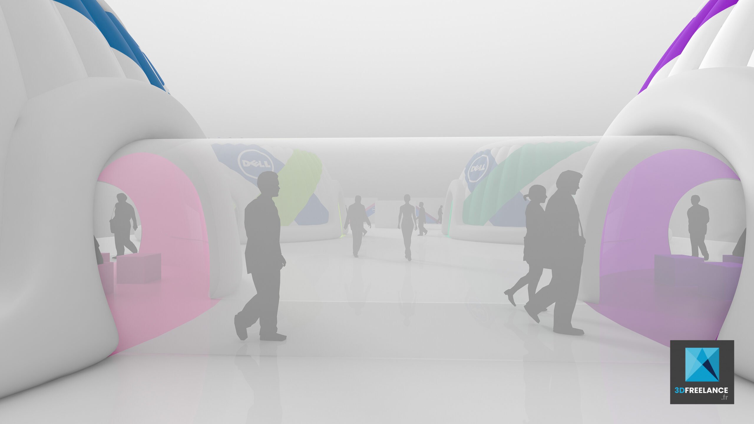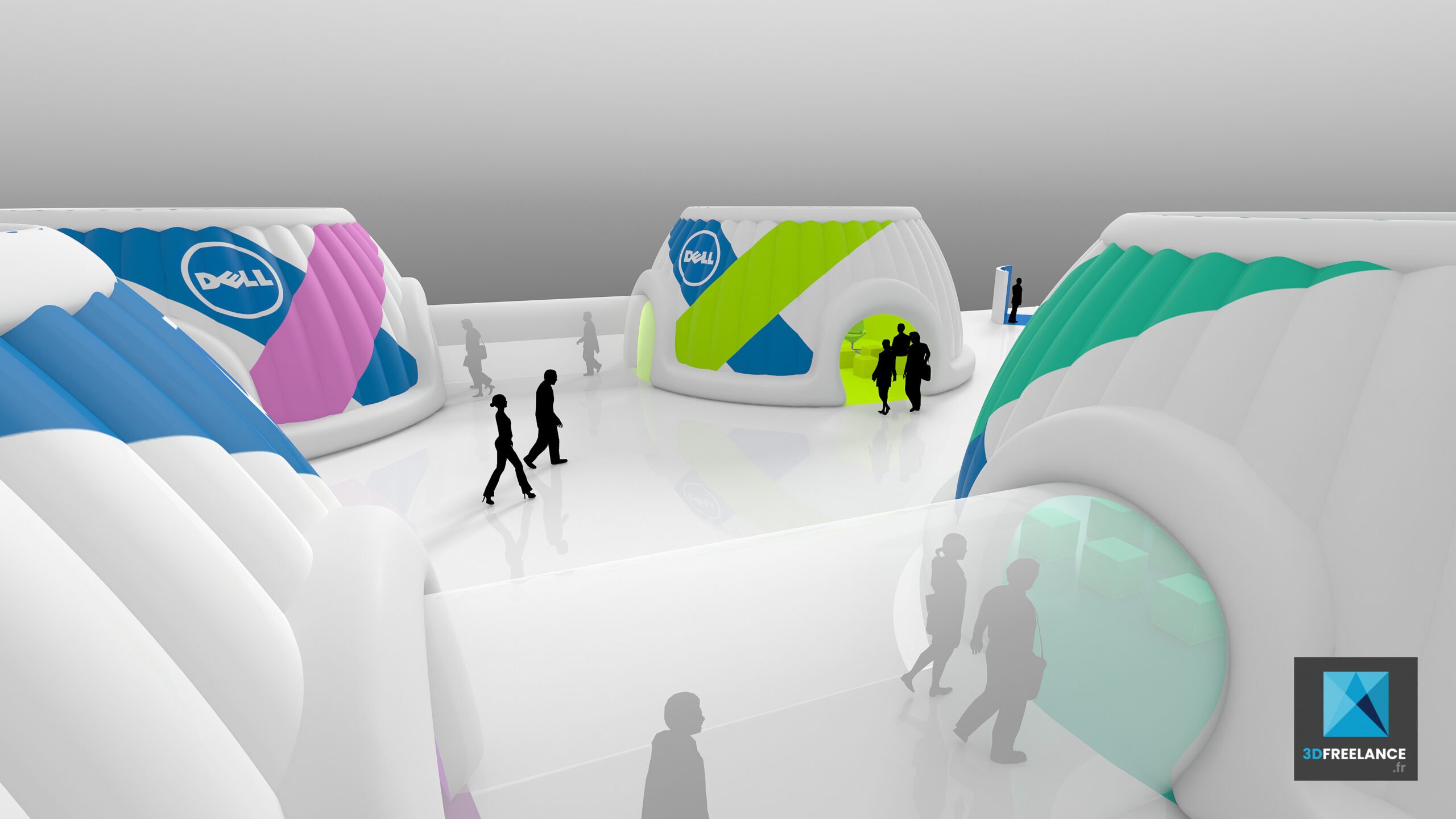 Maquette 3D d’une convention / Forum Dell dans le hall d’exposition de stand. Dell Event 2015 d’une superficie de 2000 m2. Salles de conférences dans des Iglous (Igloo) gonflables.