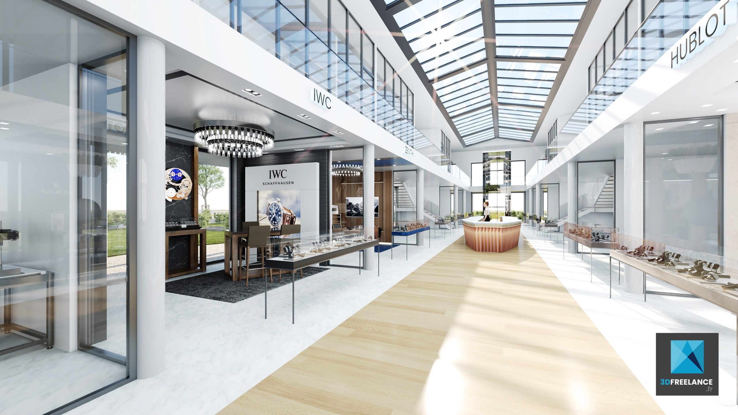 Design d’une boutique d’horlogerie pour l’enseigne de luxe IWC. Conception d’une boutique pour IWC, travail sur l’agencement, le mobilier, les matériaux, l’éclairage et intégration dans l’espace commercial. Création d’un magasin de montres et modélisation 3D de celui-ci.
