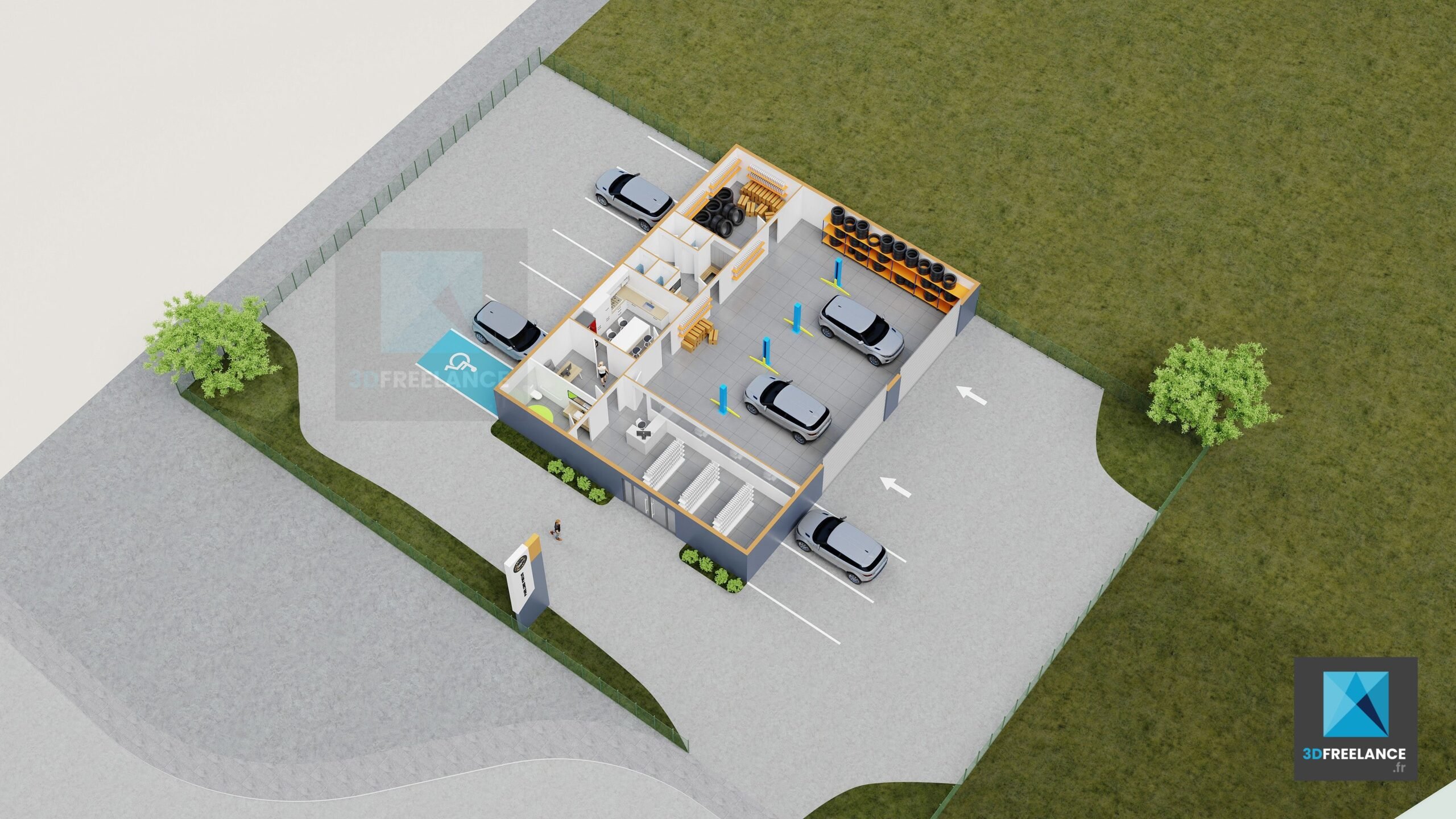 Création et design complet d’un garage automobile et modélisation 3D de celui-ci. Travail sur l’agencement des différents espaces : espace mécanique, point de vente pour les pièces détachée, espace bureau, cuisine, salle de stockage et sanitaires. La superficie de l’espace commercial est de 252m2 et celle du terrain avec parkings de 1200m2. Un totem a également été conçu afin de rendre le projet aisément identifiable. Projet d’un établissement d’entretien et de mécanique rapide et un espace magasin pour la vente des accessoires auto.