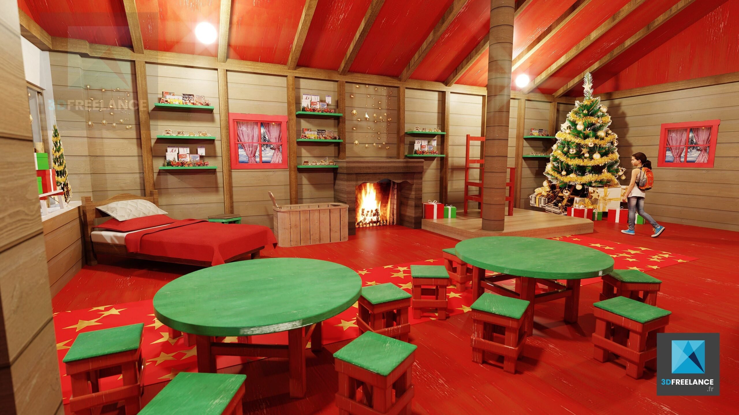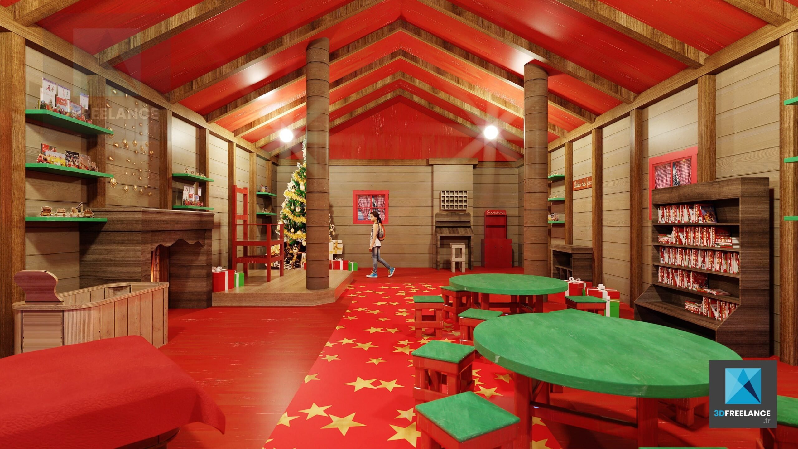 - Infographie 3D des 100m2 répartis en 4 espaces distincts (la chambre du père noël, l’atelier des lutins, la salle de bain du père noël, le salon du père noël).