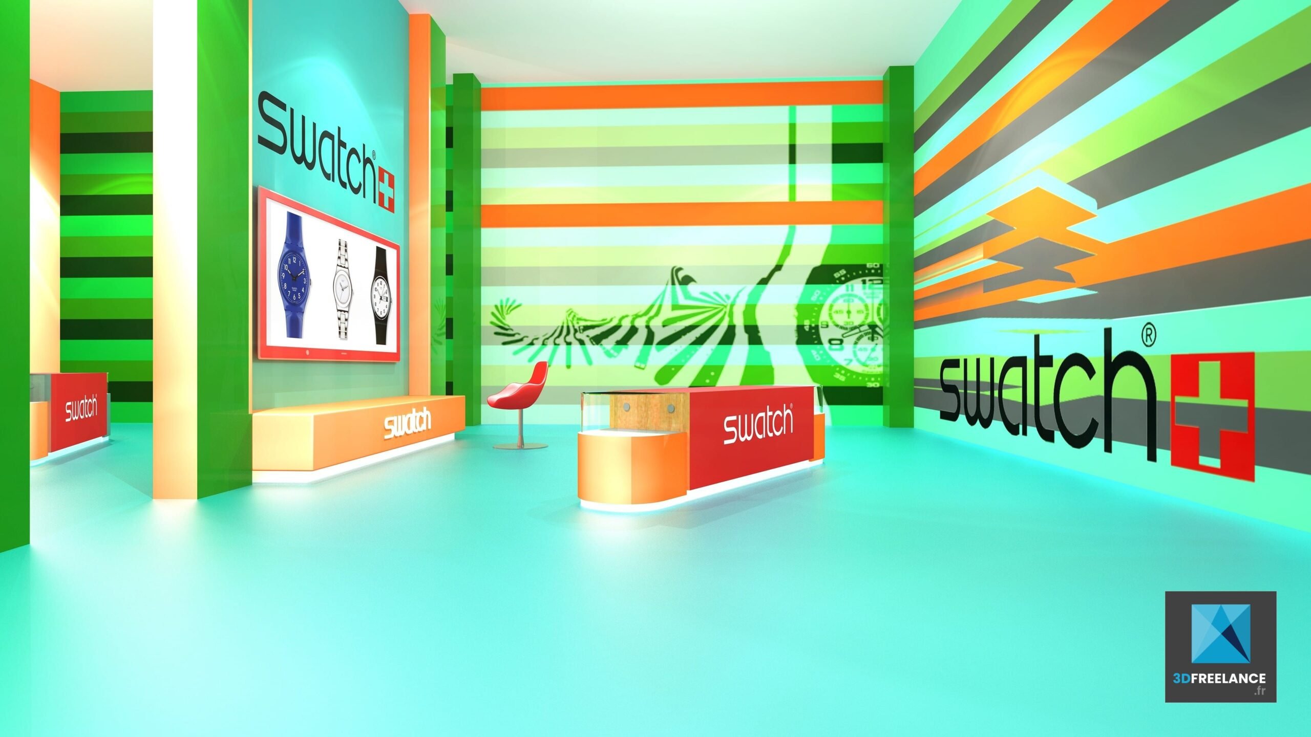 Création d’un espace de vente pour la marque de montre suisse Swatch. Design moderne et tendance. Utilisation de la charte graphique Swatch, des couleurs vives et une ambiance jeune. Design retail, point de vente, boutiques, concept store.