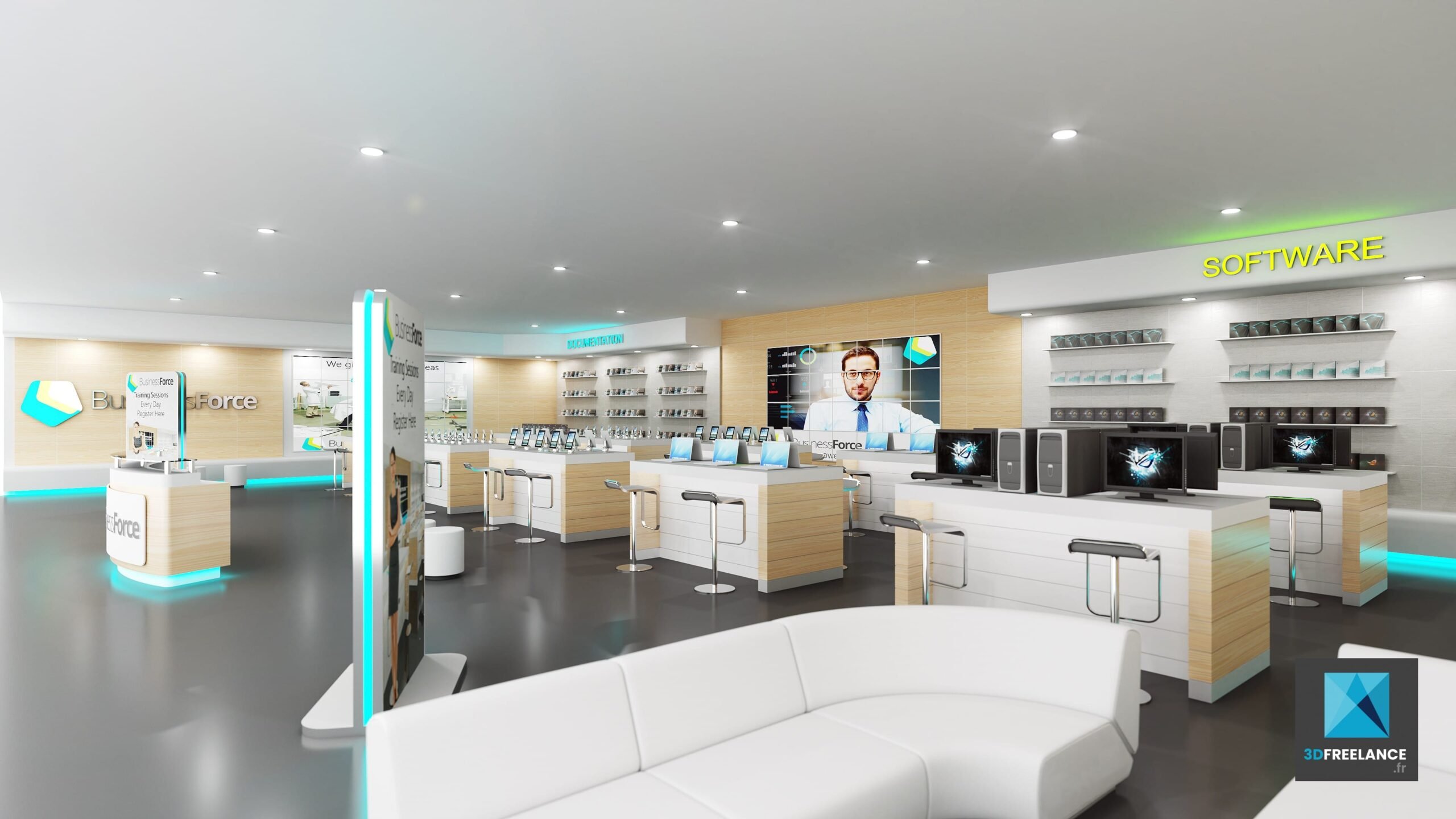 Création d’un espace de vente pour matériel informatique et high-tech. Design minimaliste et convivial avec un mélange de bois et de matière métalliques. Conception d’un magasin d’informatique, agencement, design du mobilier et choix des matériaux.