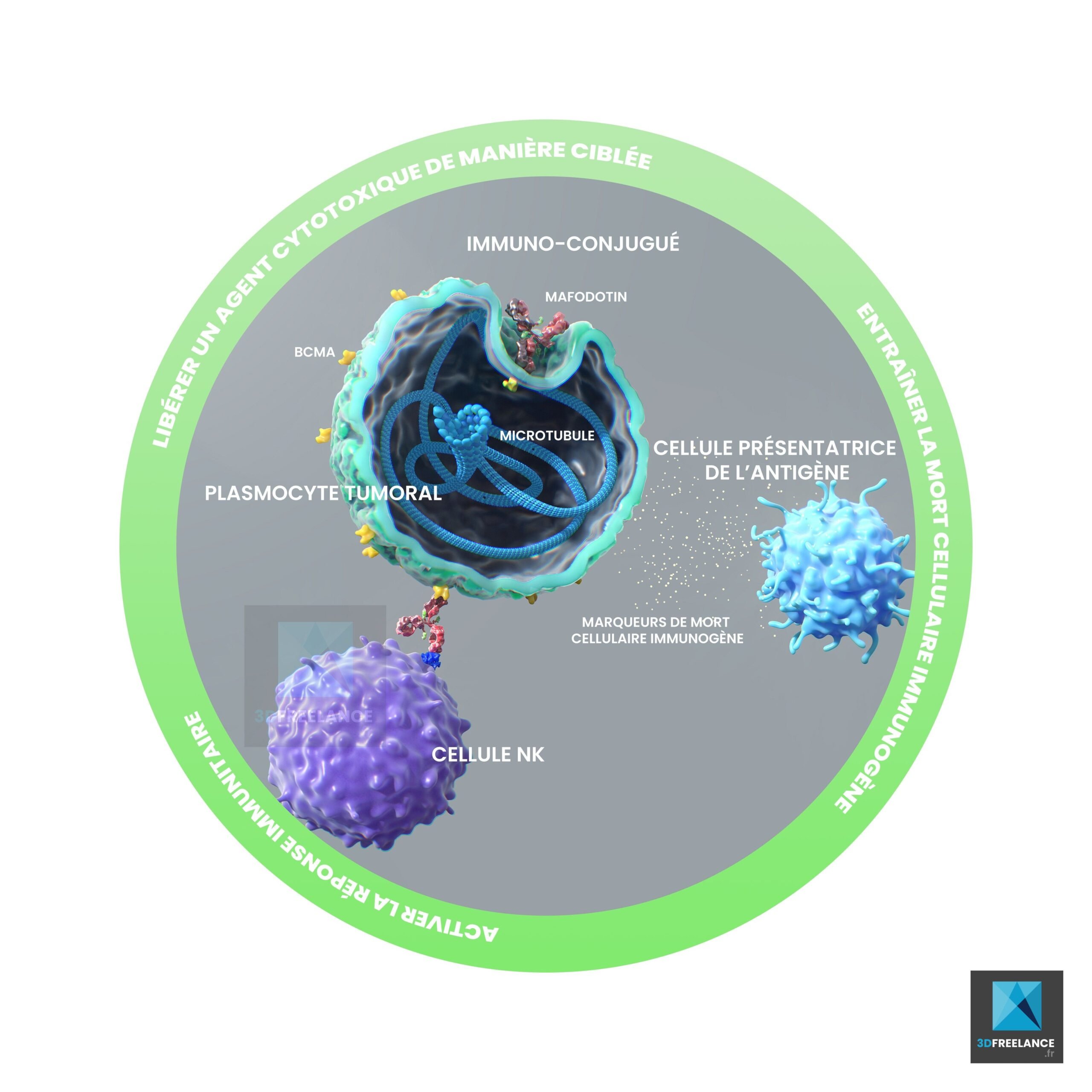 Création d’une illustration 3D médicale. Zoom au microscope sur un plasmocyte tumoral et 2 cellules. Ce visuel a pour but d’illustrer l’action d’un médicament dans le traitement du cancer. Illustration 3D d’oncologie.