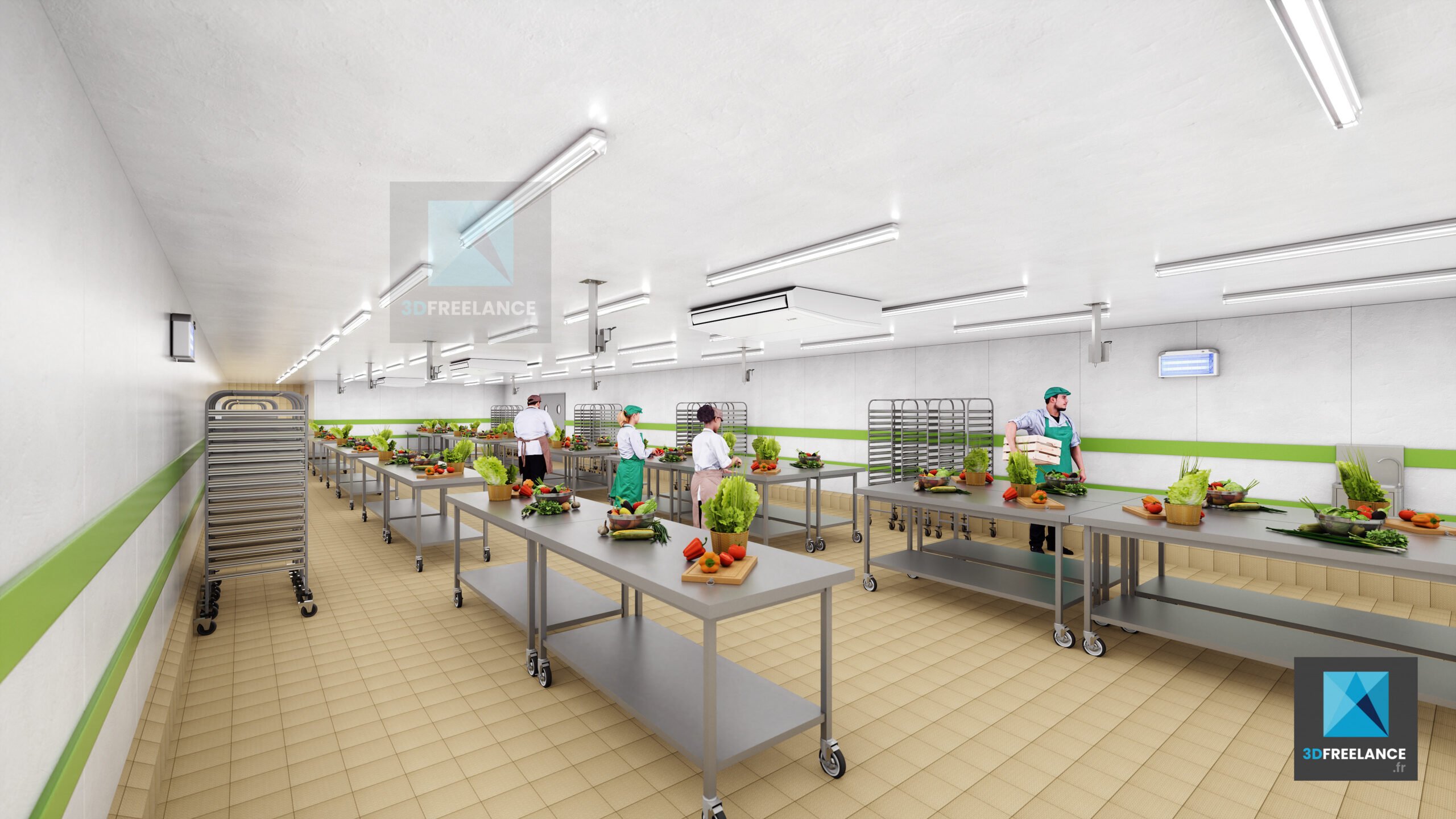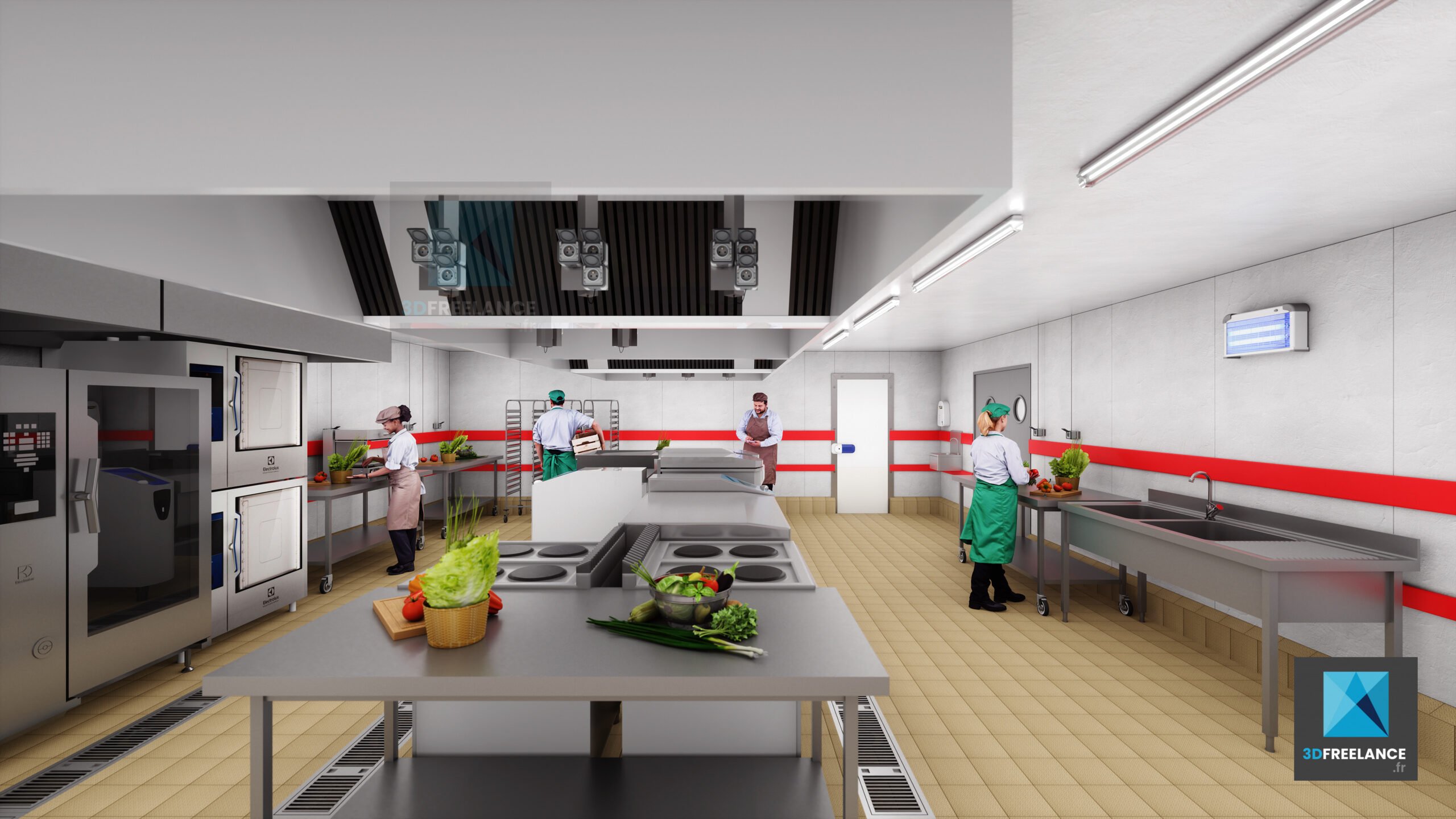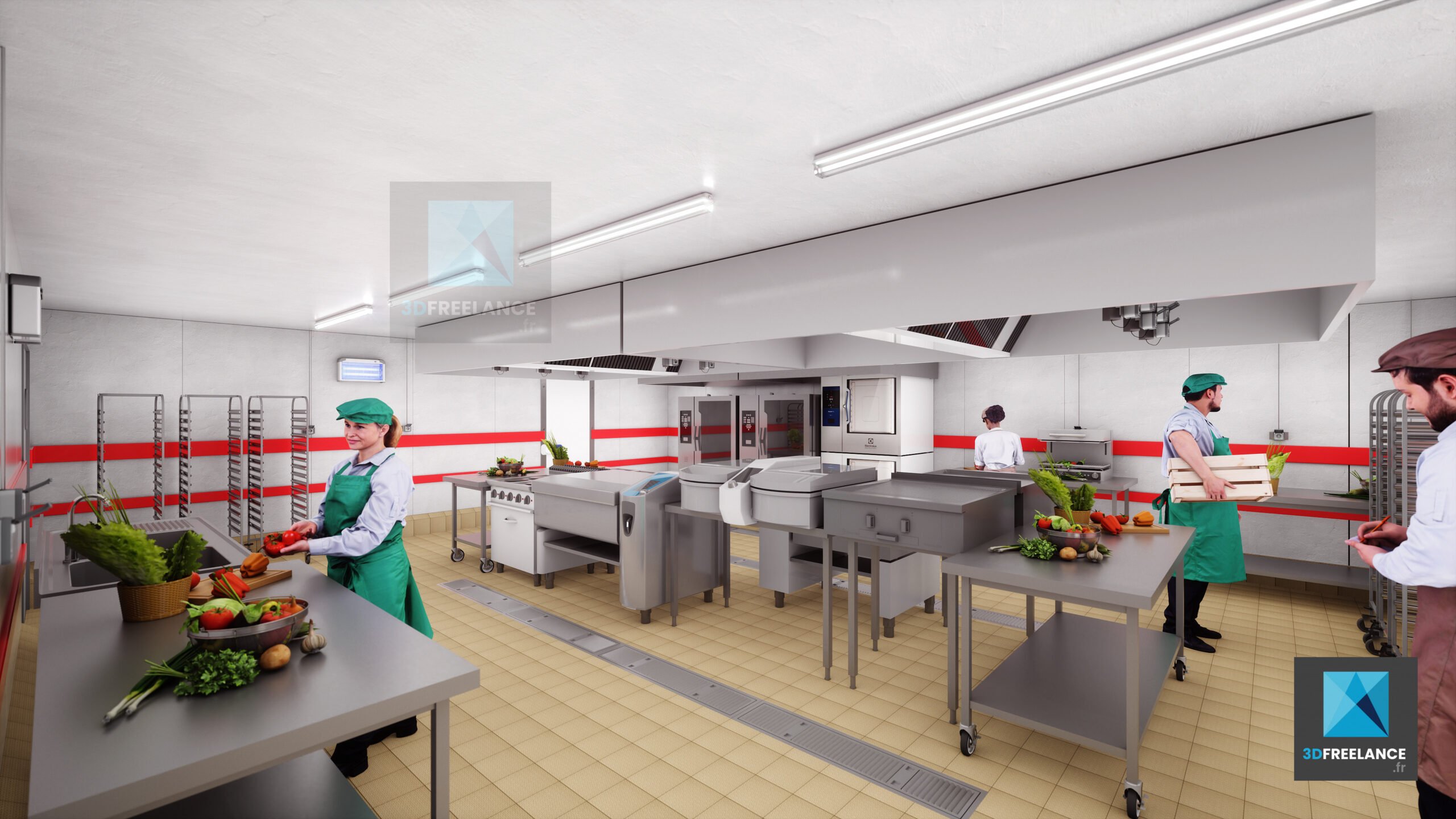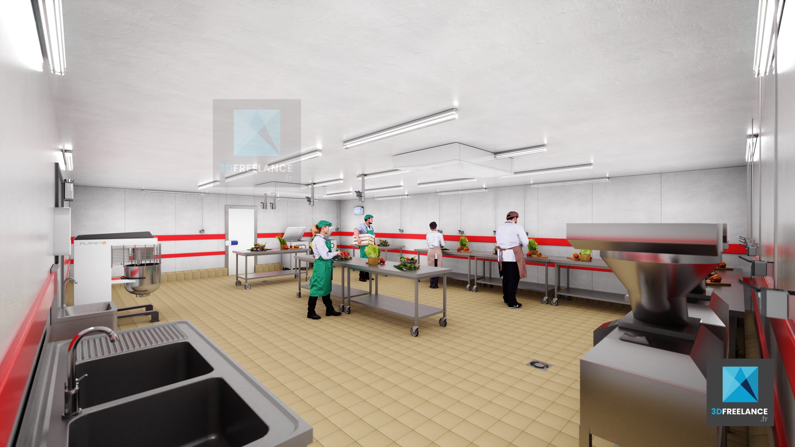 Création de perspectives 3D et de rendus d’espaces intérieures d’une cuisine de production de 2500m2. Création de vues 3D des installations, des murs et du matériel. Modélisation 3D des différents types d’espaces intérieurs. L’ensemble du matériel a été modélisé en 3D à partir de fiches produits.
