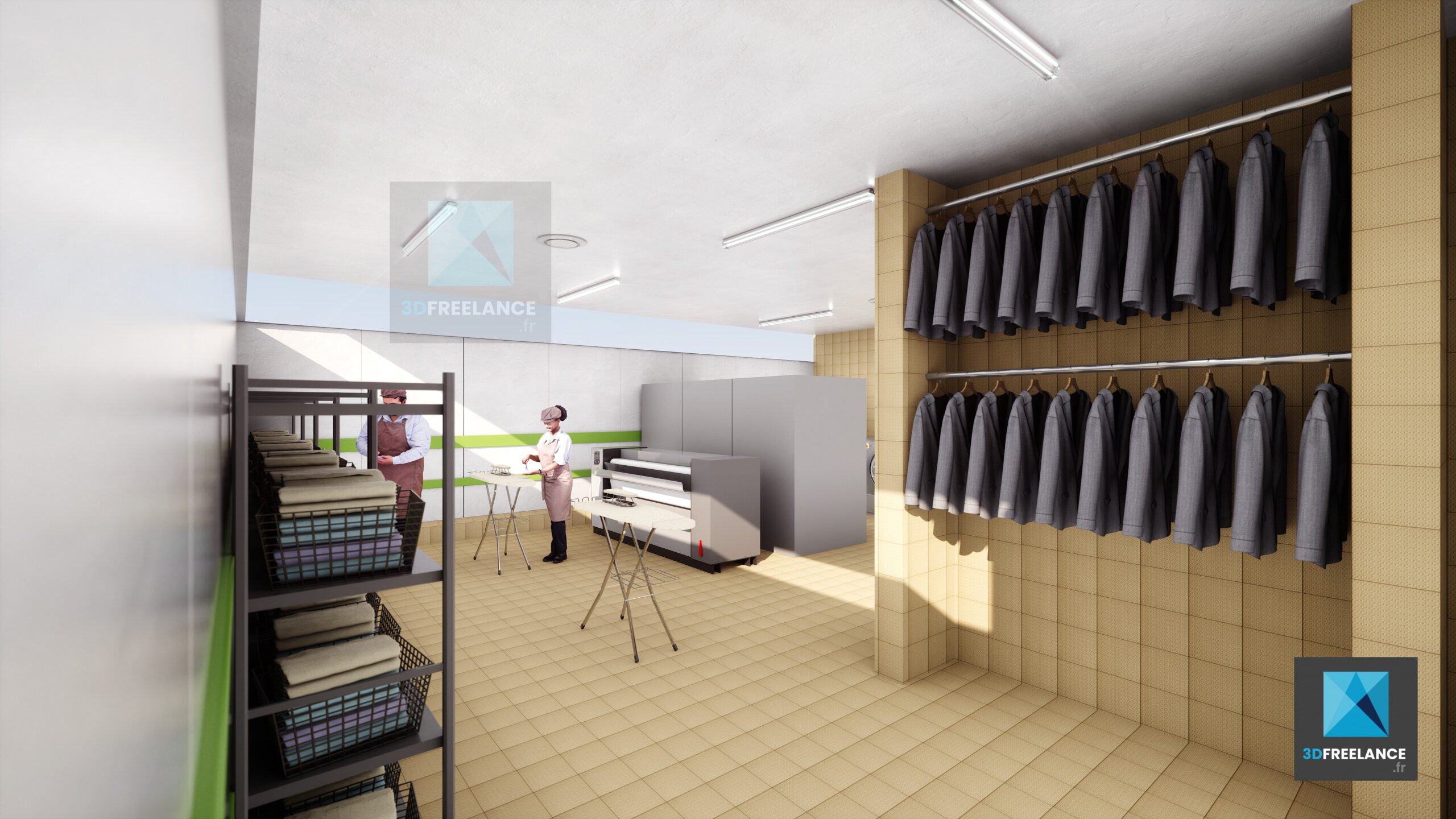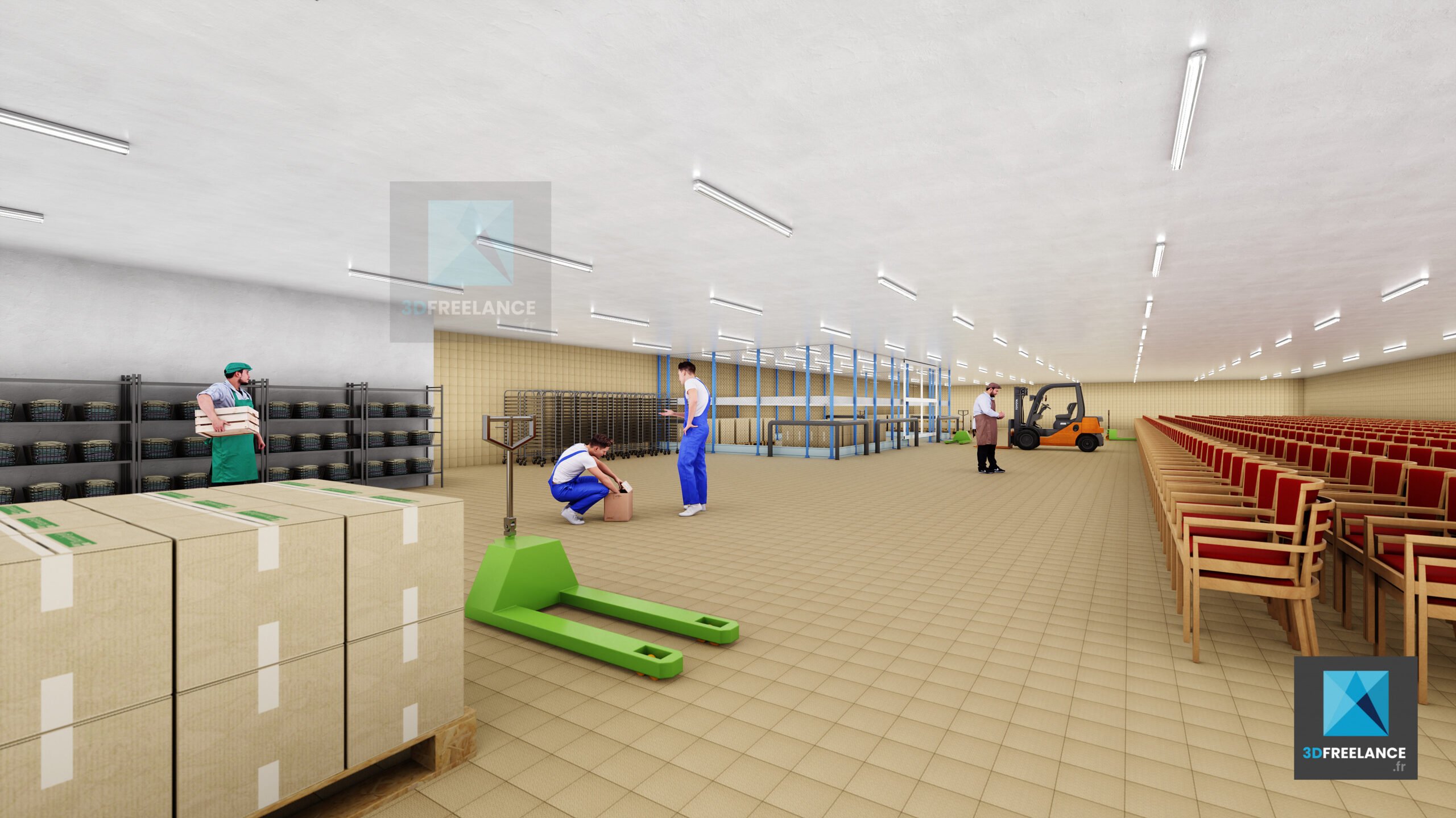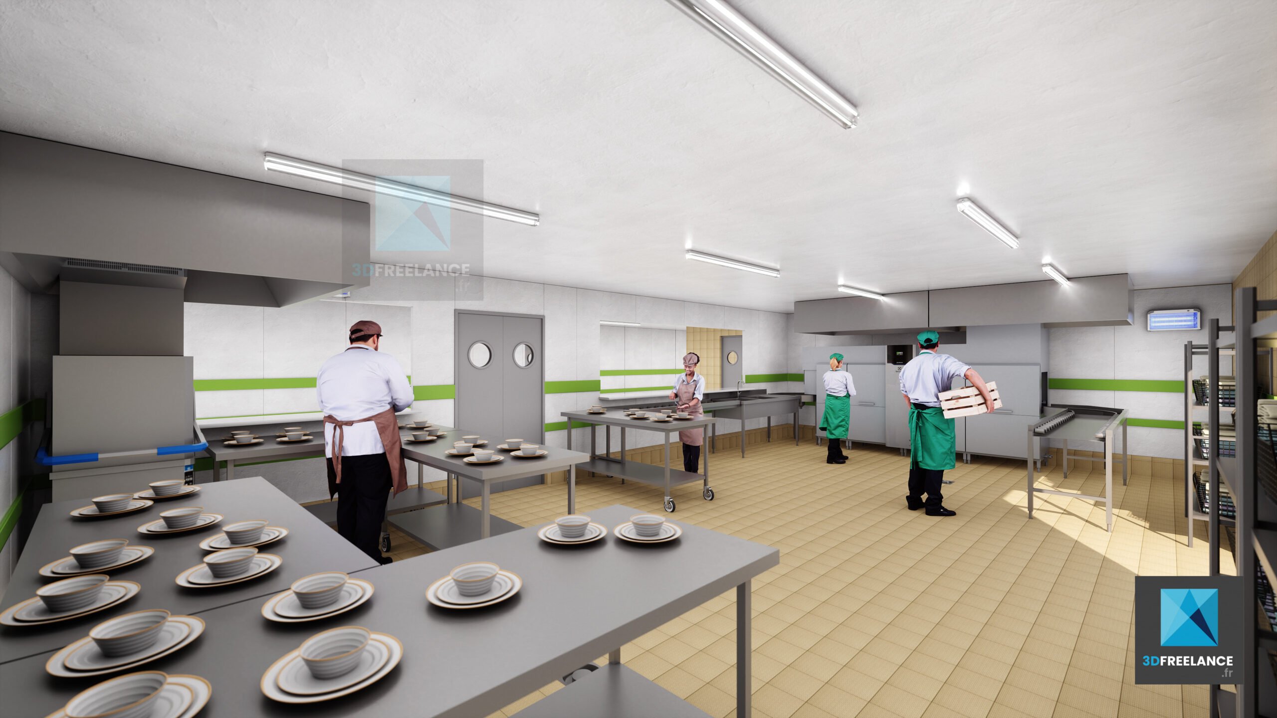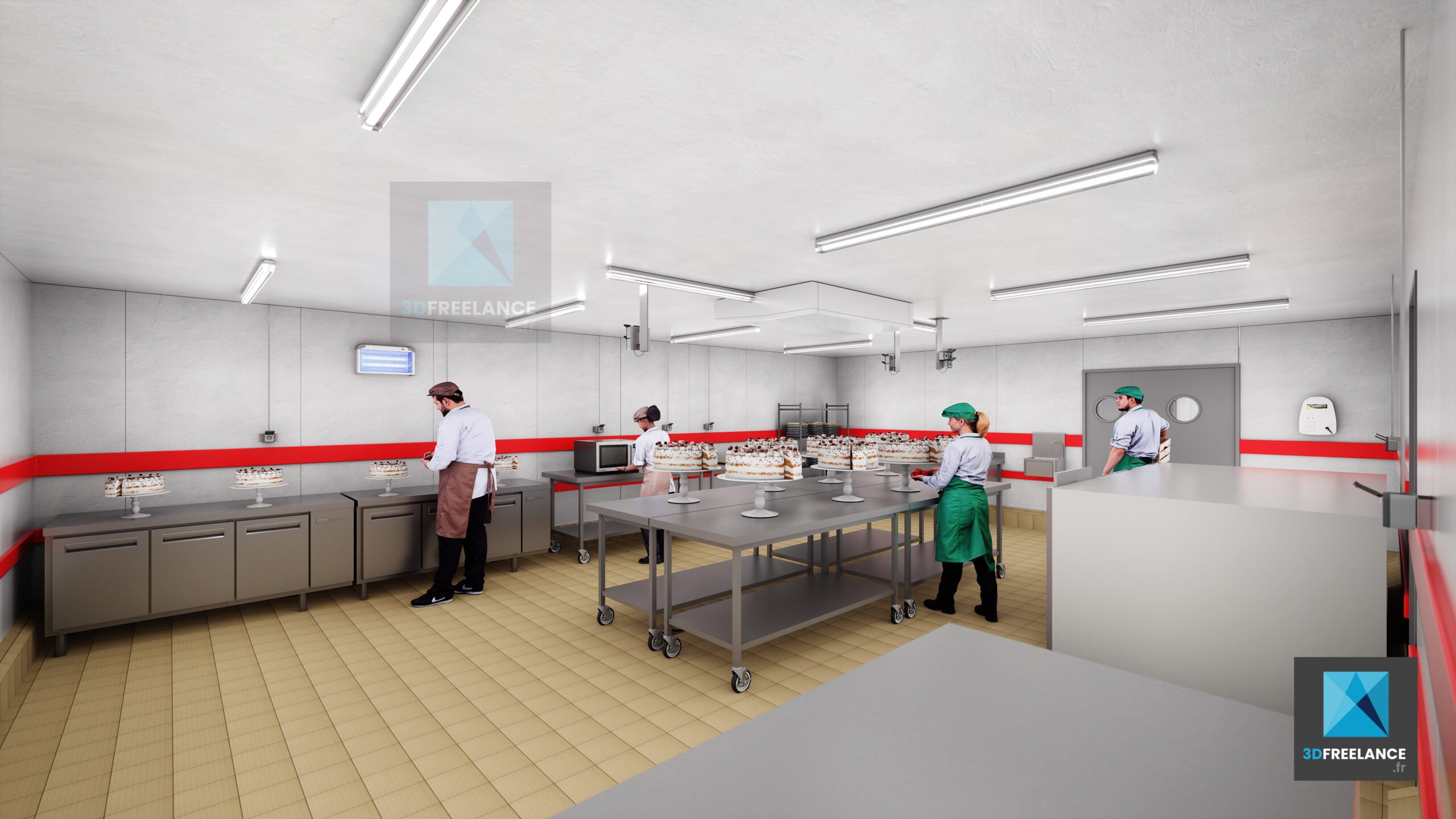 Création de perspectives 3D et de rendus d’espaces intérieures d’une cuisine de production de 2500m2. Création de vues 3D des installations, des murs et du matériel. Modélisation 3D des différents types d’espaces intérieurs. L’ensemble du matériel a été modélisé en 3D à partir de fiches produits.