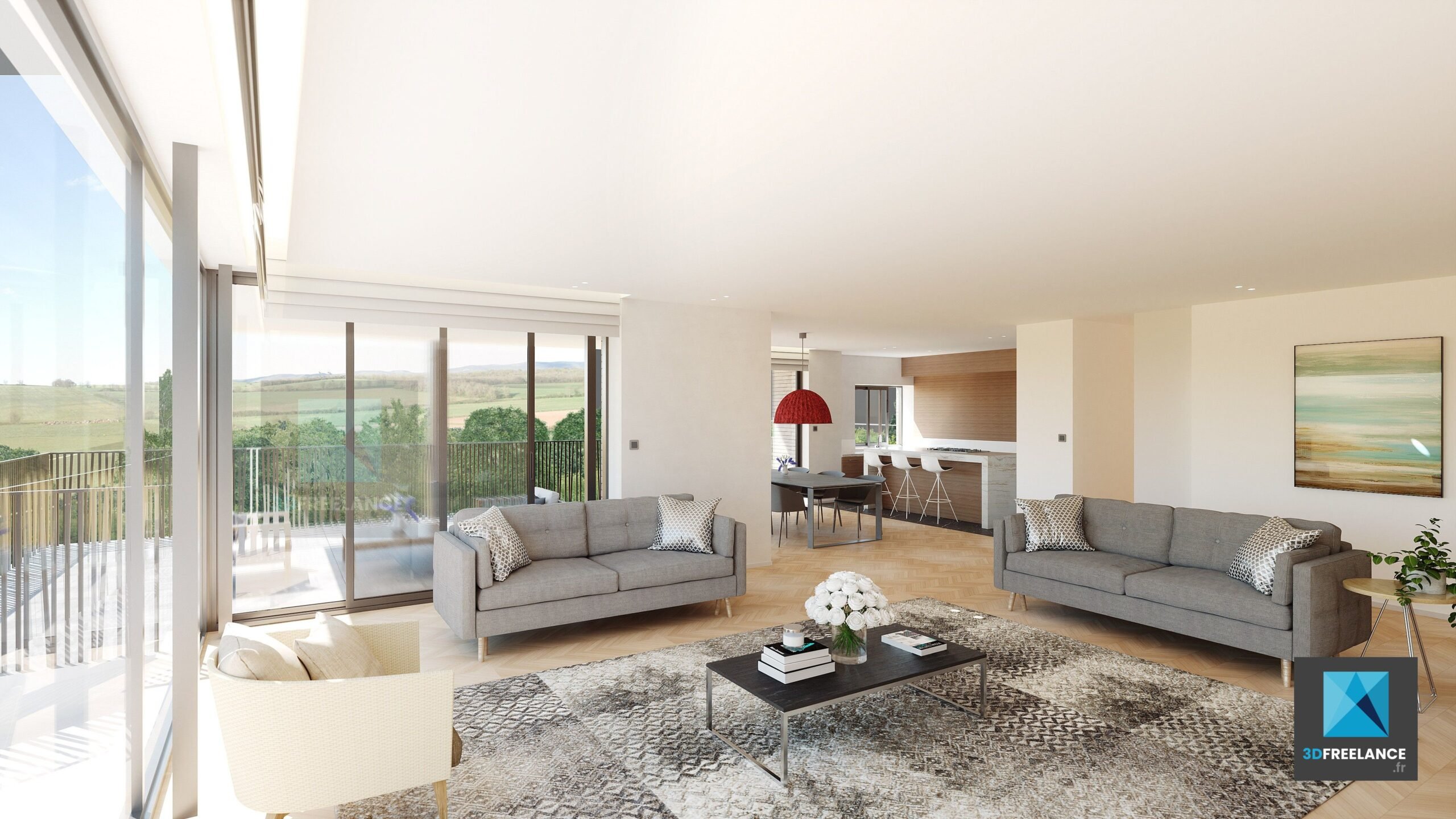 Création d’images 3D dont l’idée serait de pouvoir montrer aux clients comment sera le living et la cuisine des différents appartements. 3 superficies ont été travaillées : T2, T3 et T5.