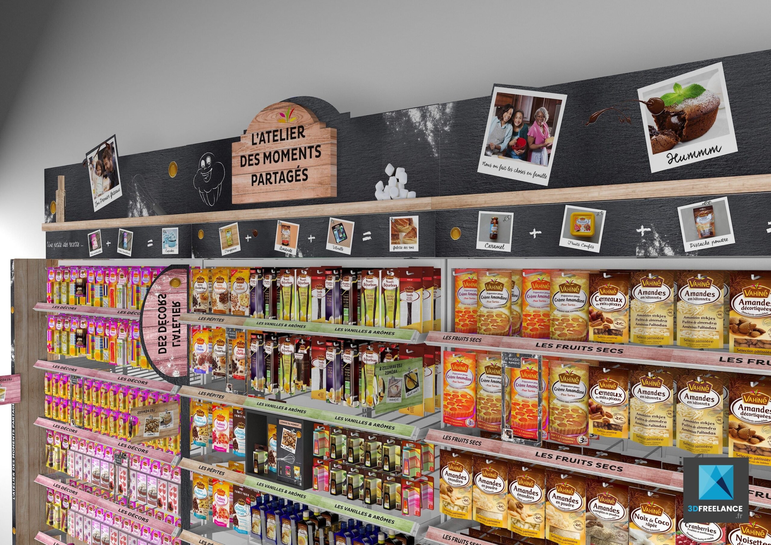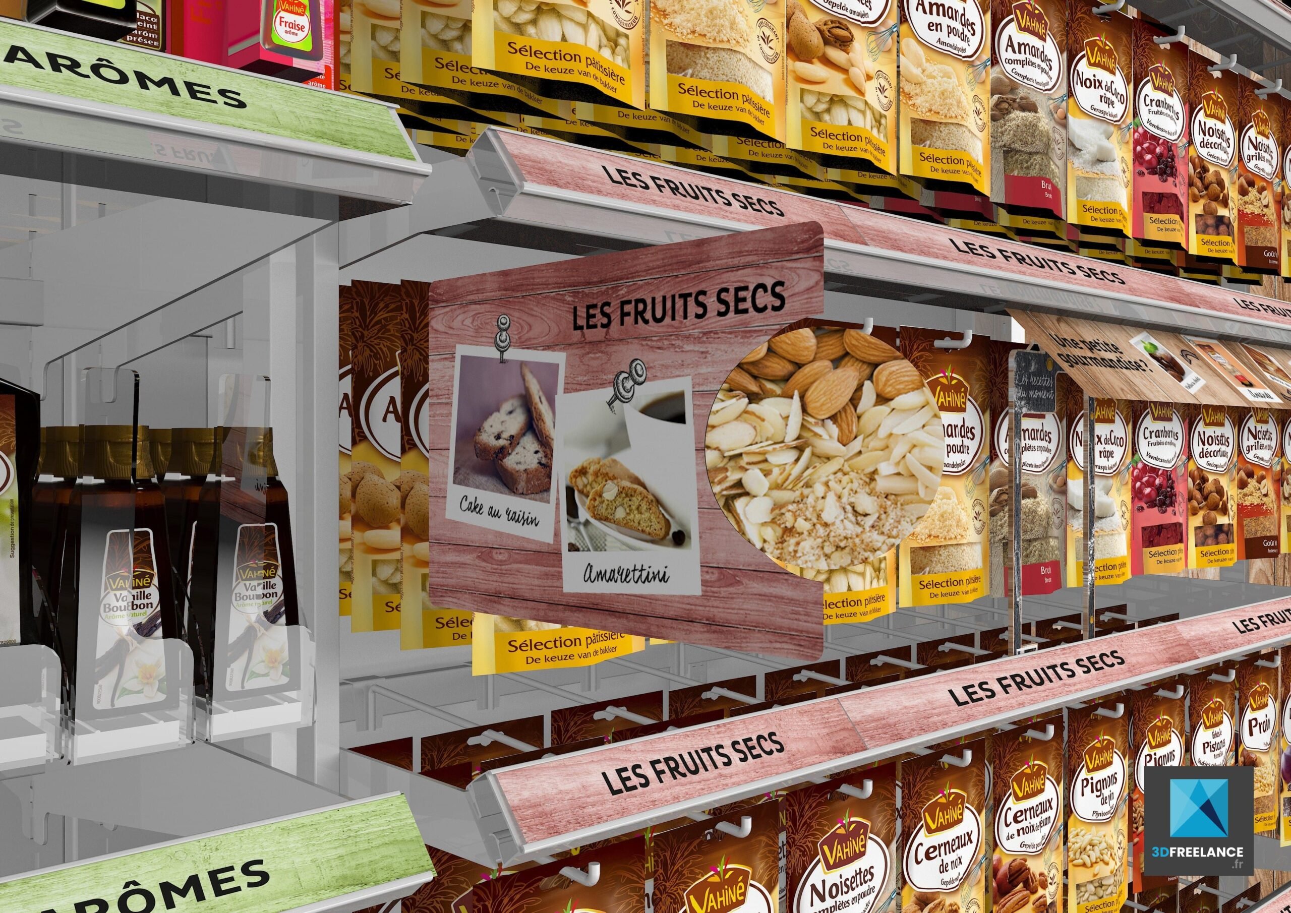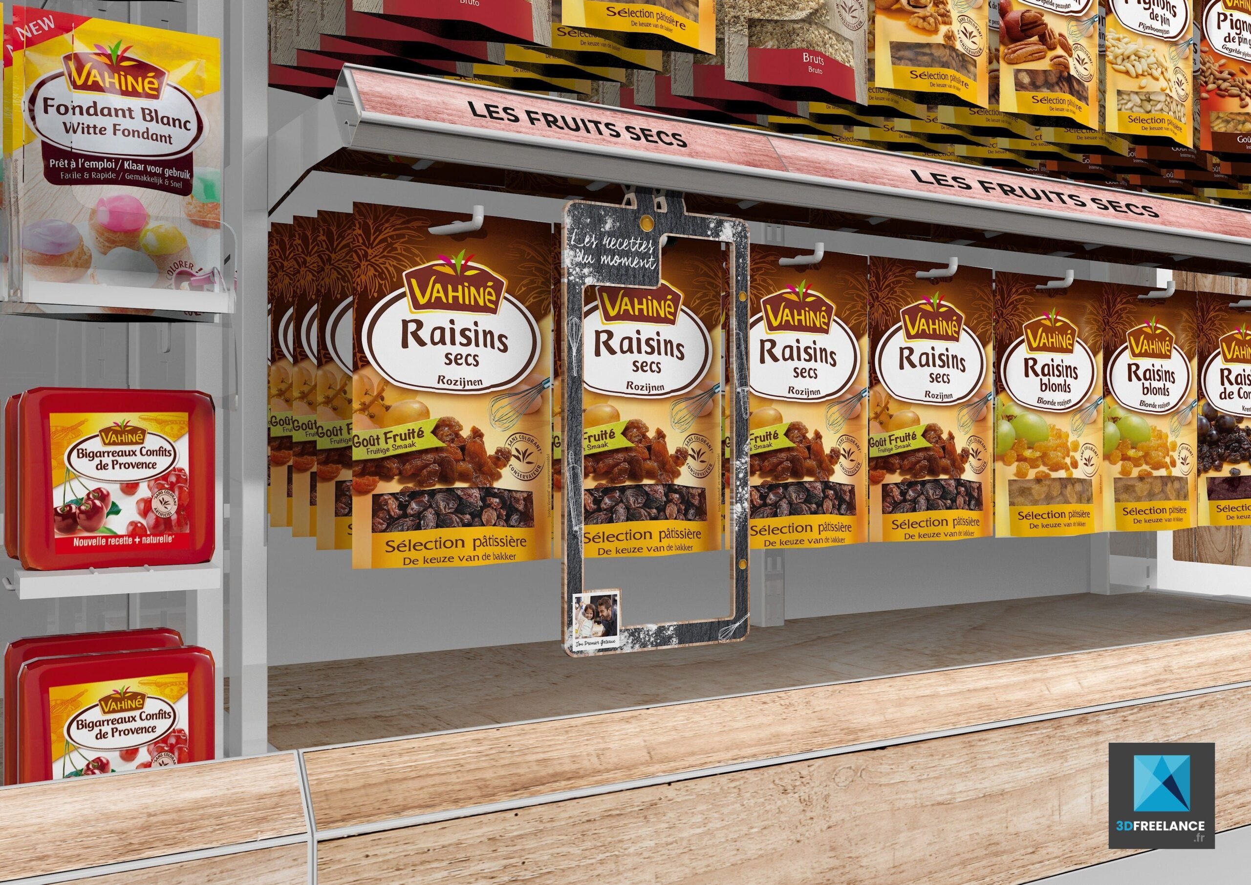 Design d’un linéaire pour les nouveaux produits de la marque de pâtisserie Vahiné. Réalisation de roughs 3D pour présenter. Création de linéaires produits pour les grandes surfaces afin de présenter les différents ingrédients de la marque Vahiné. Rendu 3D des images en très haute définition pour l’impression. Visualisation des différentes gammes tels que pépites, arômes, décors, nappages, fruits confits, aides pâtissières et fruits secs. Rough linéaire, perspective 3d linéaire, images 3d linéaire.