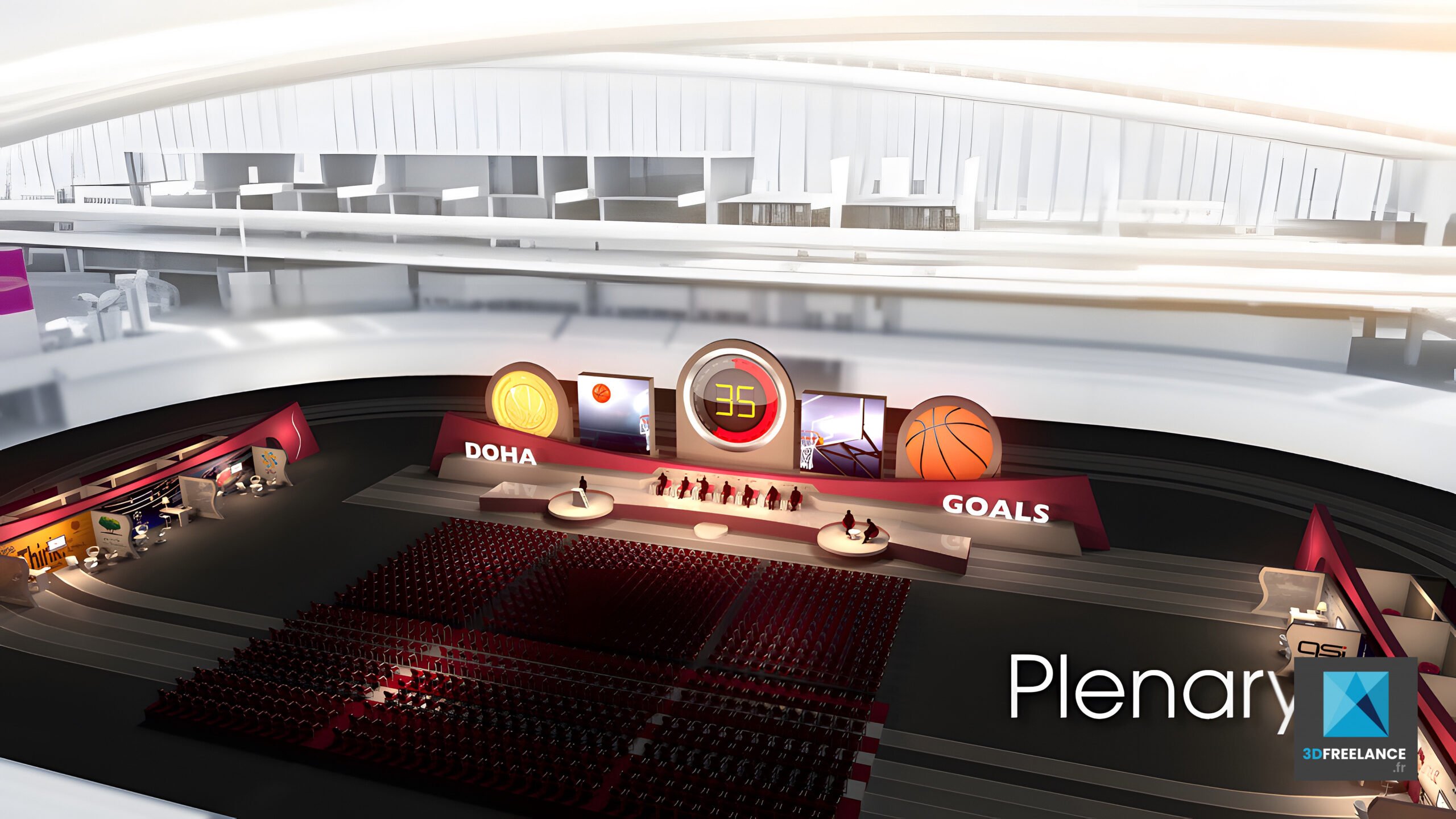 Maquette 3D animée de la scénographie de forum – Film 3D événementiel création d’une animation 3D pour présenter un forum sur le sport. Le forum a eut lieu dans un stade au Qatar.