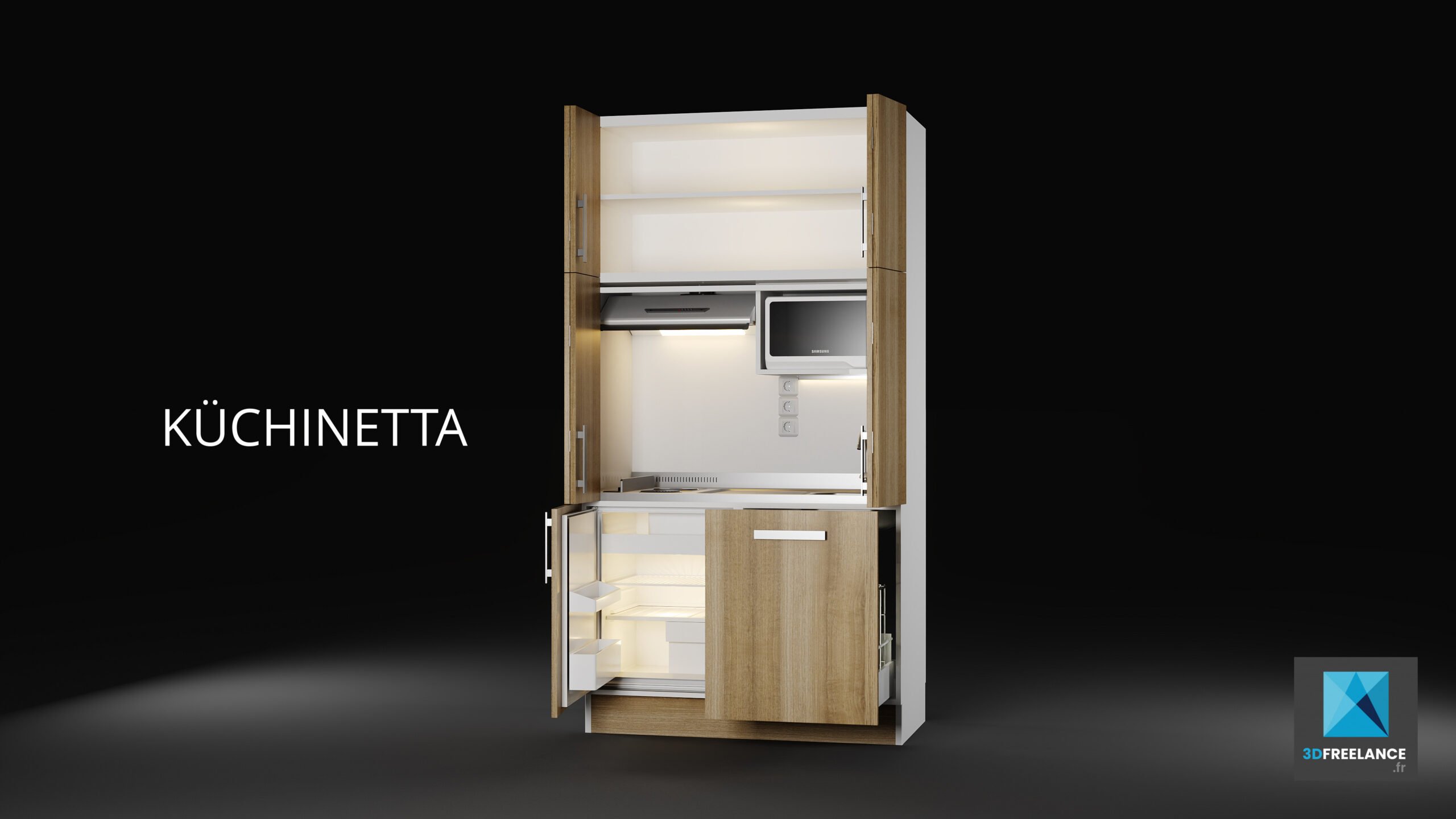 Création d’une animation 3D et de rendus 3D pour présenter le design d’un meuble de cuisine. Modélisation 3D d’une Kitchenette. Mise en valeur du produit grâce a un éclairage et des matériaux de qualité. Réalisation d’une animation 3D d’une Kitchenette, d’un meuble de cuisine.