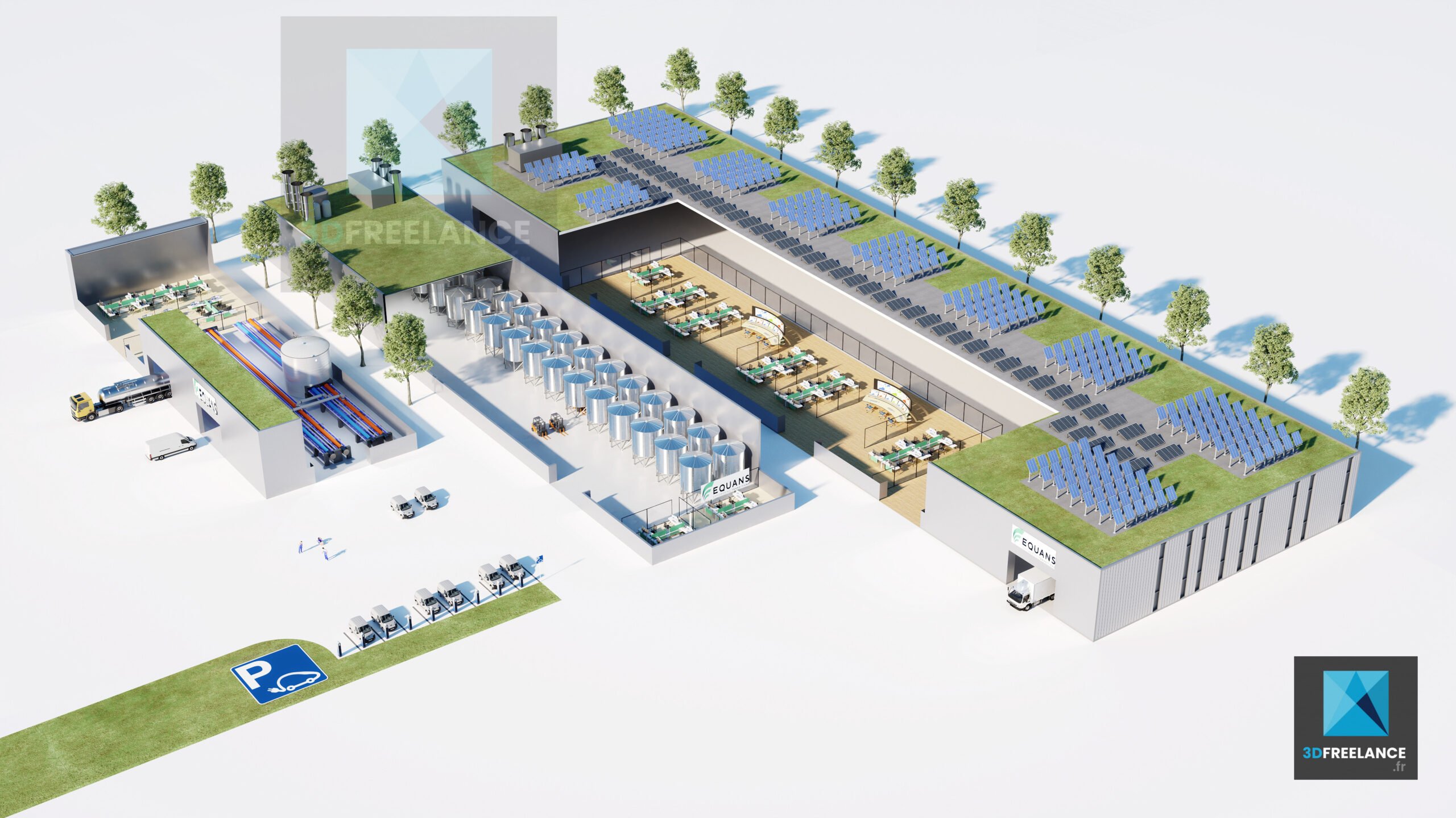 Création de deux plans en infographie 3D pour une usine et pour un bâtiment d’entreprise.