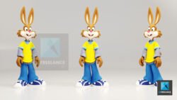 Création d’un personnage 3D de lapin. Illustration 3D d’un personnage de lapin. Modélisation 3D du personnage et travail sur la création d’un squelette de déformation afin de pouvoir créer différentes postures. Personnage de lapin avec des grandes oreilles.