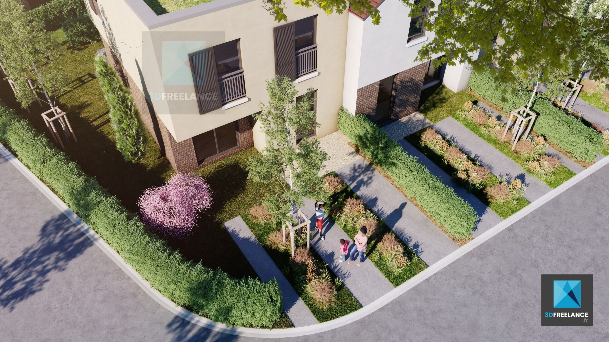 Création de 3 perspectives 3D pour le dépôt de permis de construire d’un lotissement. La modélisation a été réalisée à partir des plans coupes et façades. Perspectives pour déposer le projet.