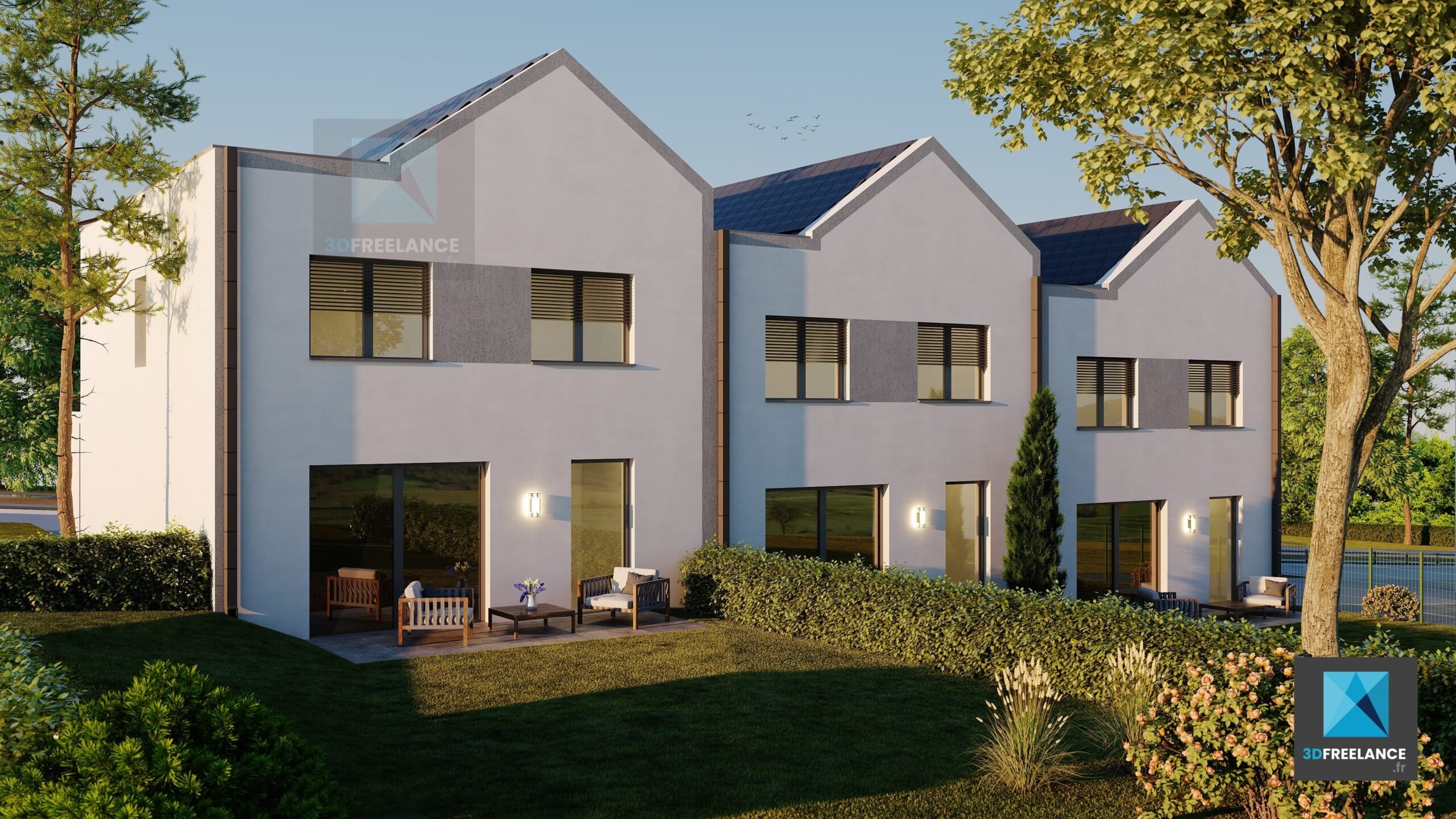 Réalisation d’une perspective HD de nuit (couché de soleil) de face avant du programme. Mise en valeur des bâtiments par le biais des spots lumineux prévus à cet effet (placés à l’entrée des logements sous l’avancé de toit / dalle en béton).