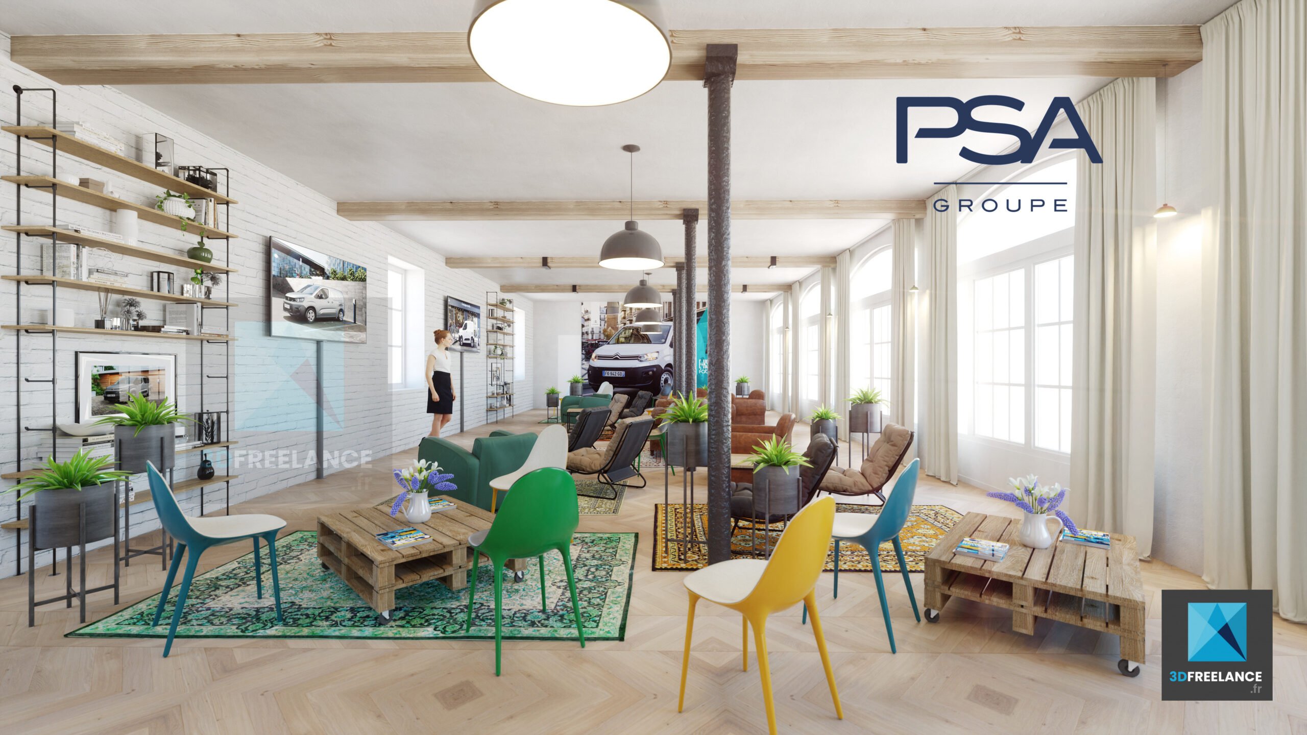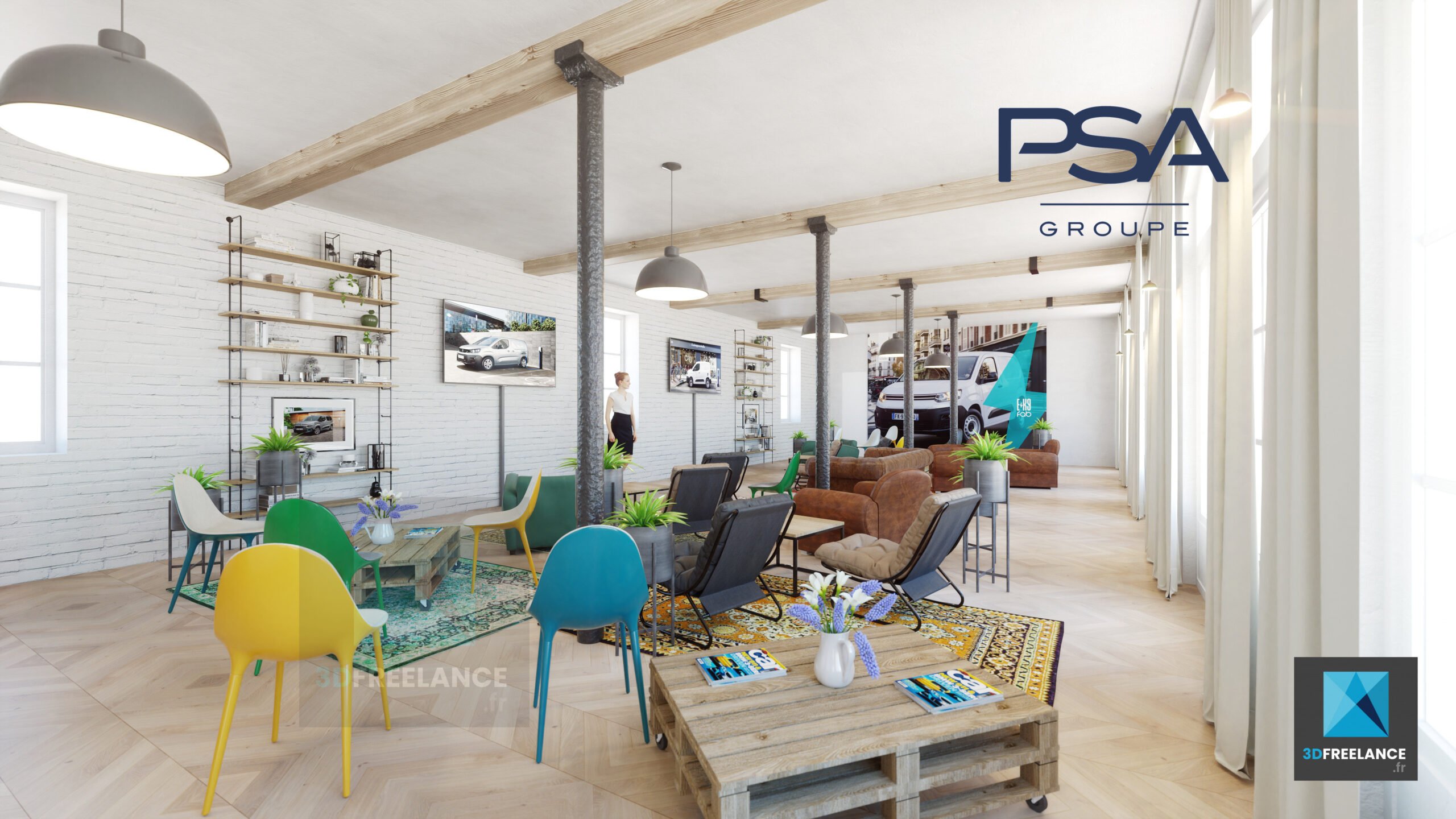 Création d’un rough 3D d’une conférence de presse automobile dans un hôtel. Design et implantation d’un événement pour PSA dans un hôtel. 25 places assises et 2 écrans. L’idée était de créer un univers et une ambiance en tendant vers un esprit tiers lieu en réutilisant au maximum le mobilier du lieu mélangé avec du mobilier rapporté et des éléments de décoration. Création d’images 3D d’un tiers-lieu pour une conférence de presse.