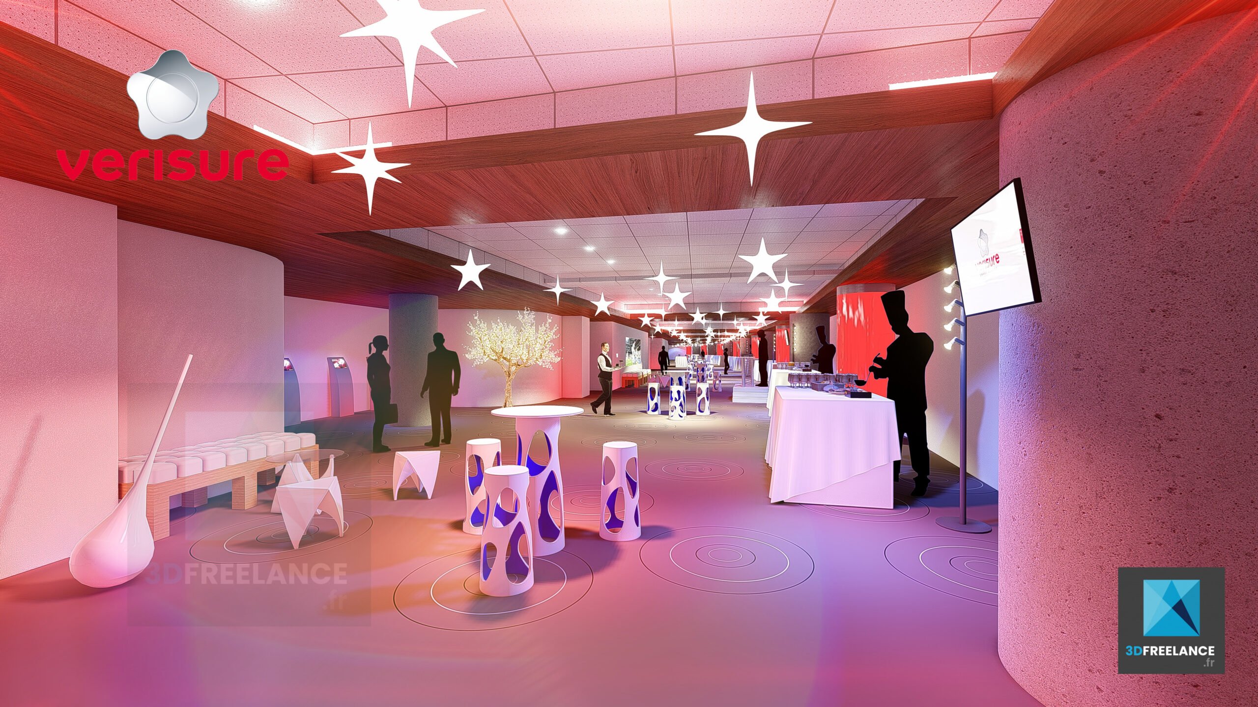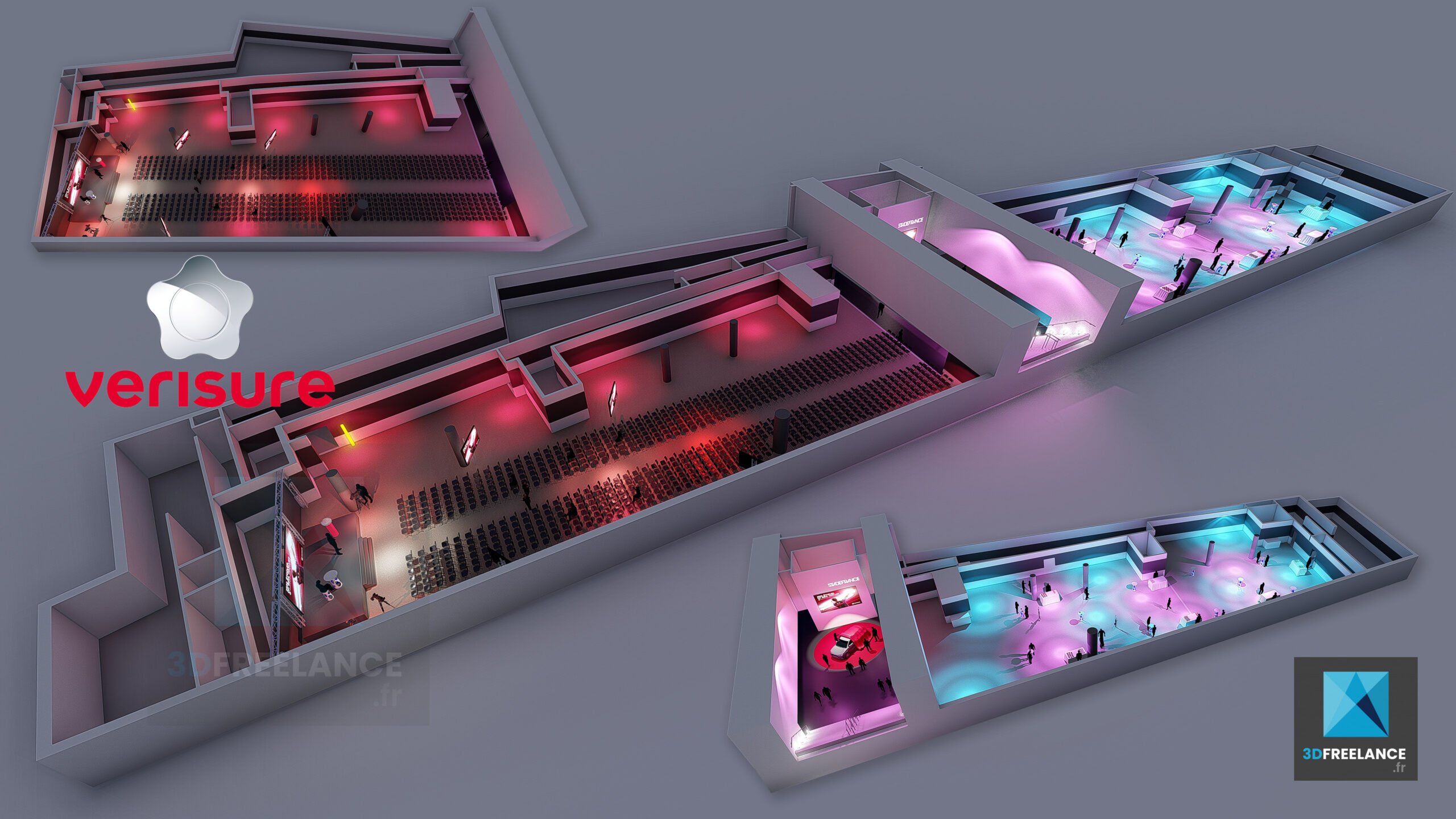 Création d’images d’ambiance pour l’événement Verisure au stade de France. Création de 4 roughs événementiel et d’un plan 3D d’implantation des espaces événementiels. Modélisation 3D des espaces centraux, plénière et soirée.