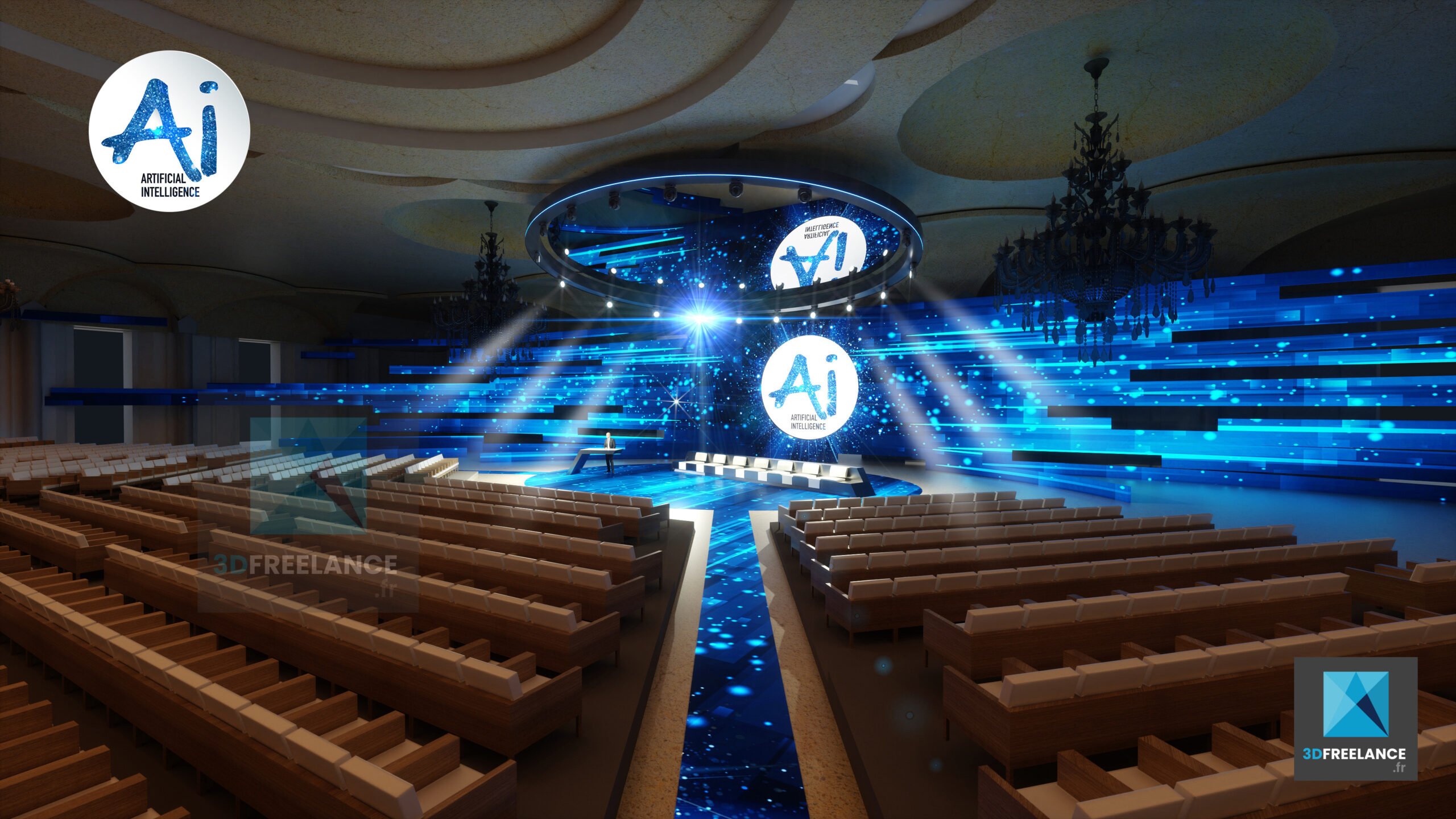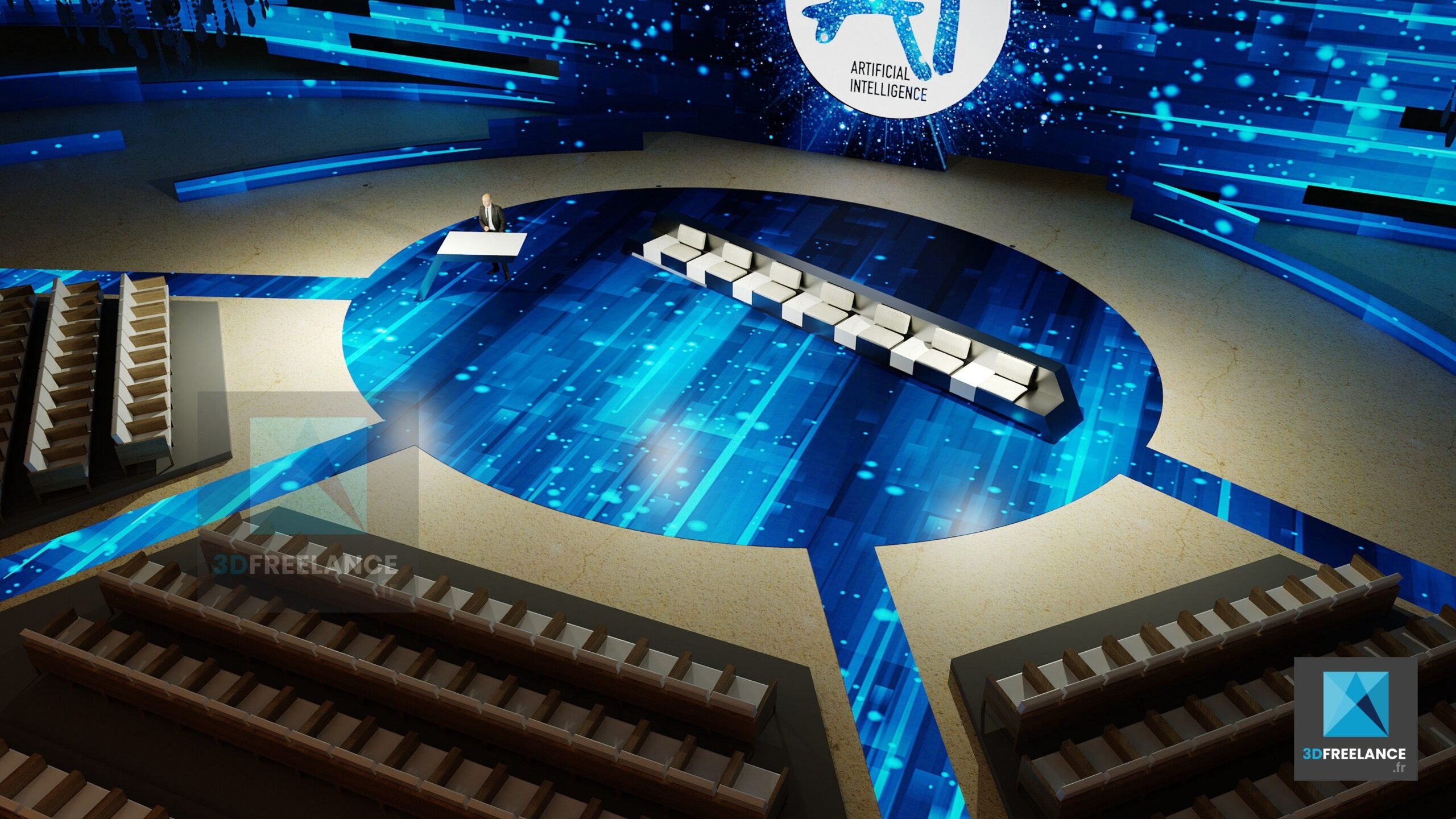 Création d’images d’ambiance événementielles pour un forum sur l’intelligence artificielle. Modélisation 3D et rendu de la plénière et réalisation de rough et d’une animation 3D.