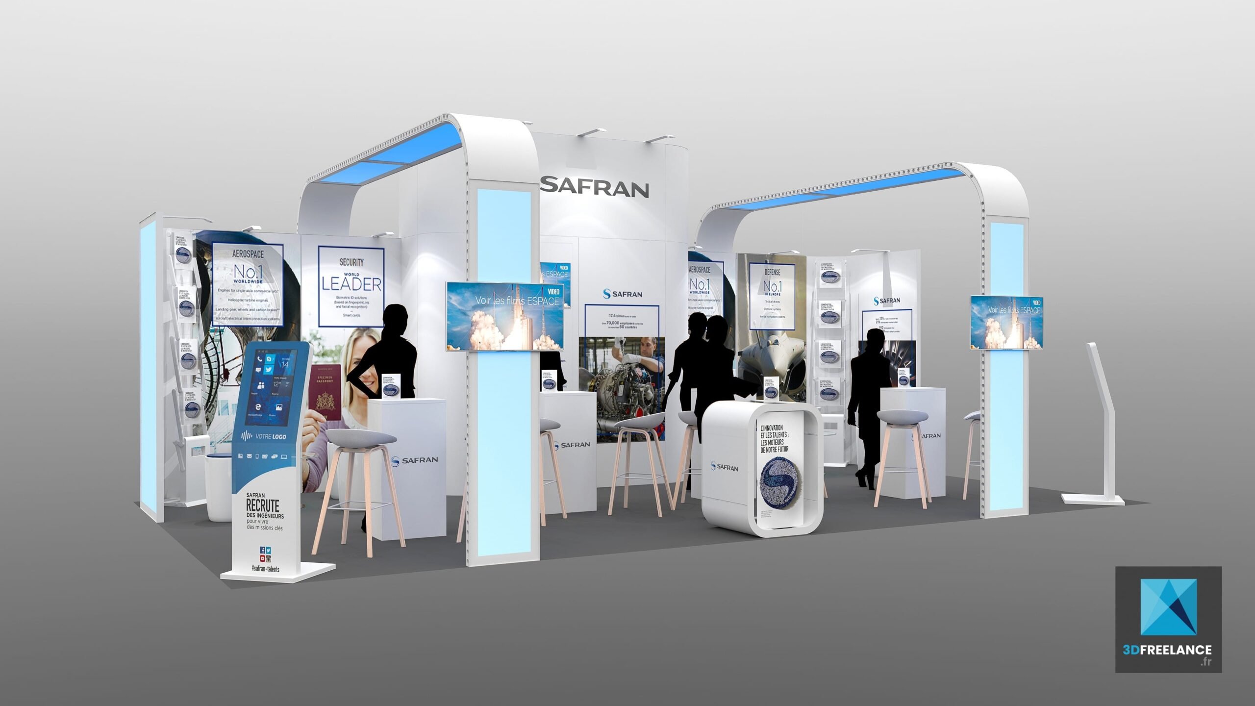 Création d’un design pour un stand modulaire pour Safran. Concept, agencement et création de perspectives 3D. Conception d’un stand pour l’entreprise Safran à partir d’éléments modulaires. Ce stand est à destination de salons étudiants et il est déclinable en trois superficies (18m2, 24m2 et 36m2) grâce à un système d’emboîtement d’éléments. Superficies: 18, 24, 36m2. Ouverture sur 3 cotés.