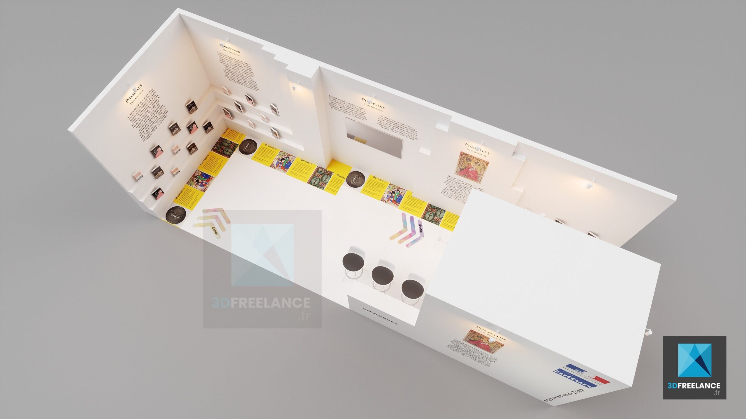 Travail sur la réalisation d’un stand pour le salon du livre et création de rough 3D et d’une modélisation. Le stand a une superficie de 9m x 3m. Il s’agit d’un stand sur le salon du livre ancien. Les plans techniques du stands ont également été réalisés. Stand dans le style d’une galerie d’art.