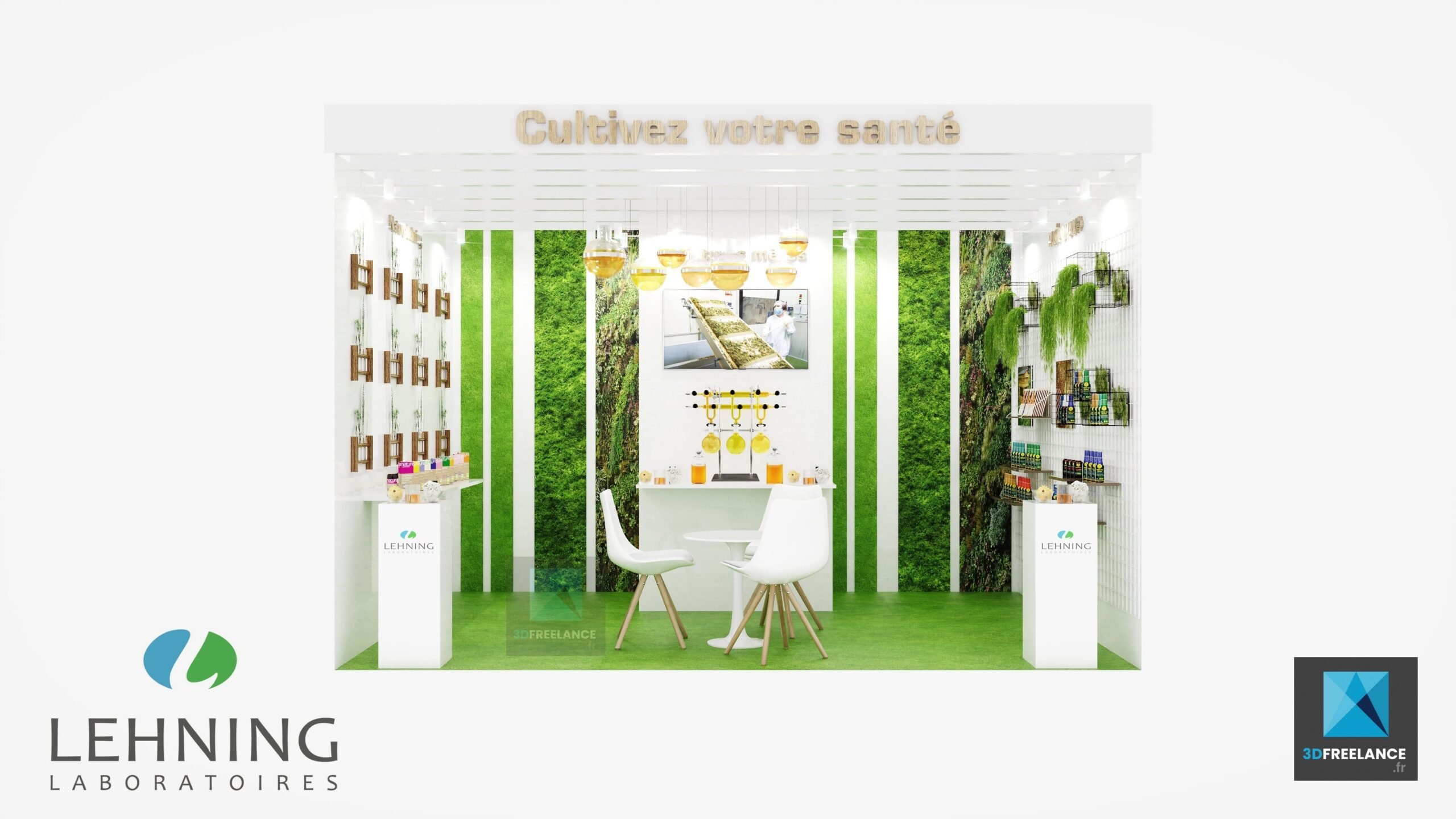 Design d’un stand d’une superficie de 12m2 pour un laboratoire dans le domaine de la santé. Stand avec une dominance de blanc pour le coté épuré et vert pour le coté végétal et naturel. Ouverture sur un seul coté, une table et des chaises pour les présentations produits.