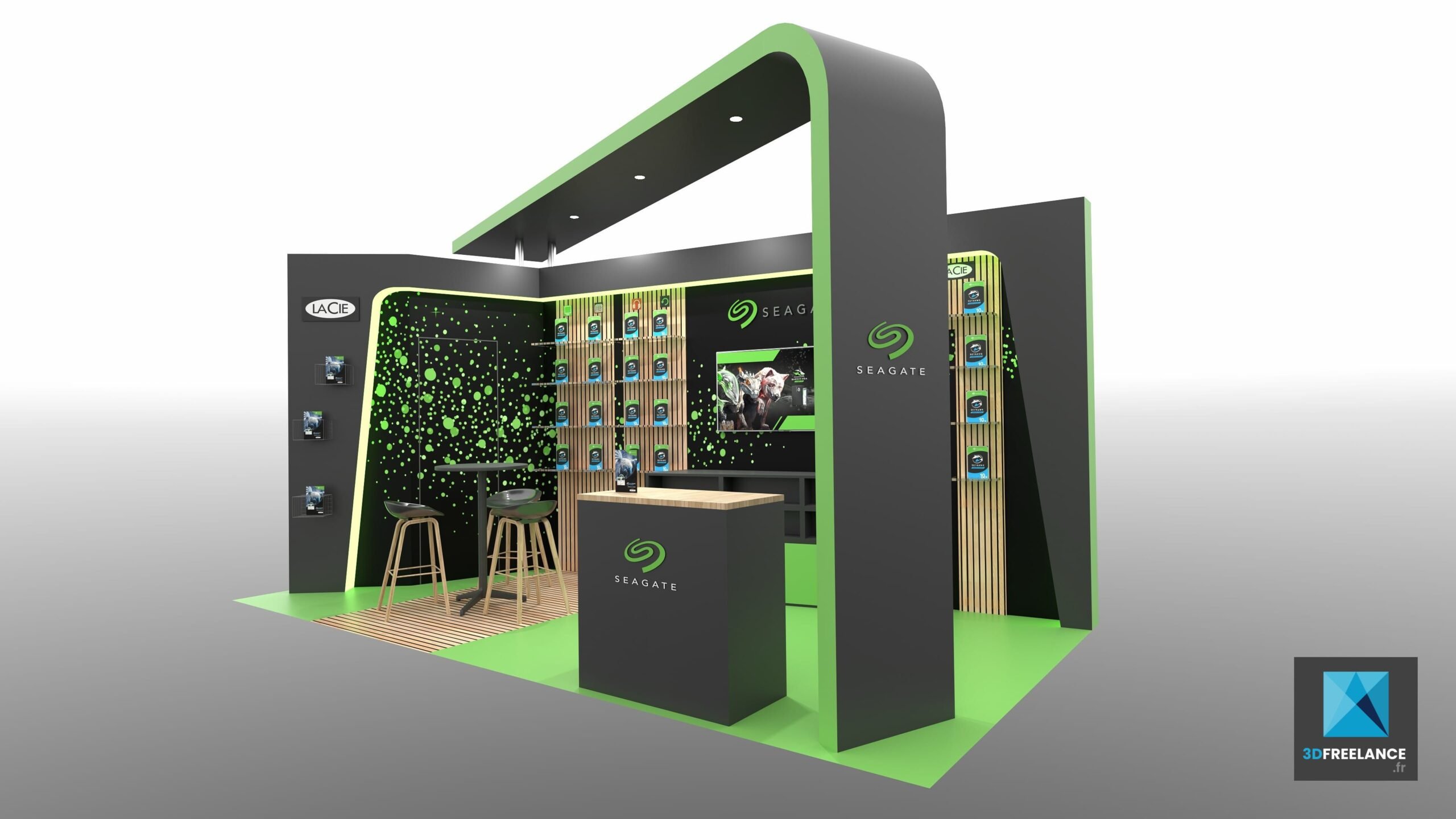 Design d’un stand d’une superficie de 18m2 pour le fabricant de disques durs Seagate.